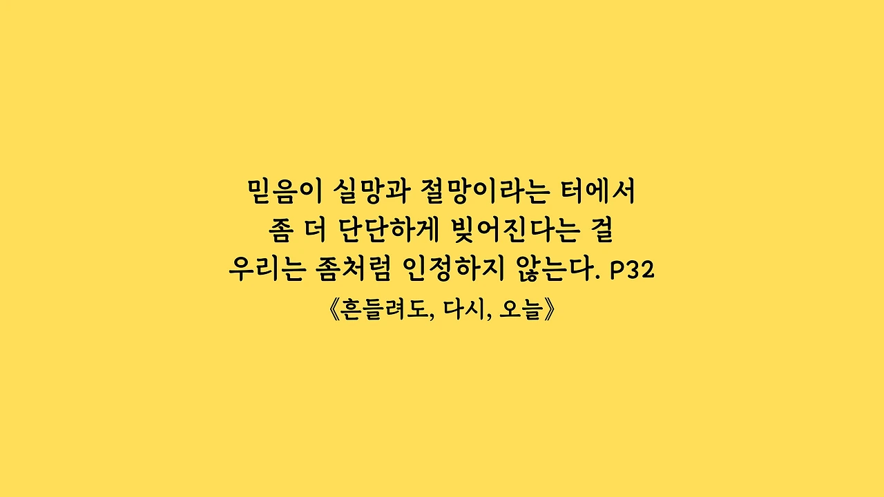 믿음이 실망과 절망이라는 터에서 좀 더 단단하게 빚어진다는 걸 우리는 좀처럼 인정하지 않는다. (32)