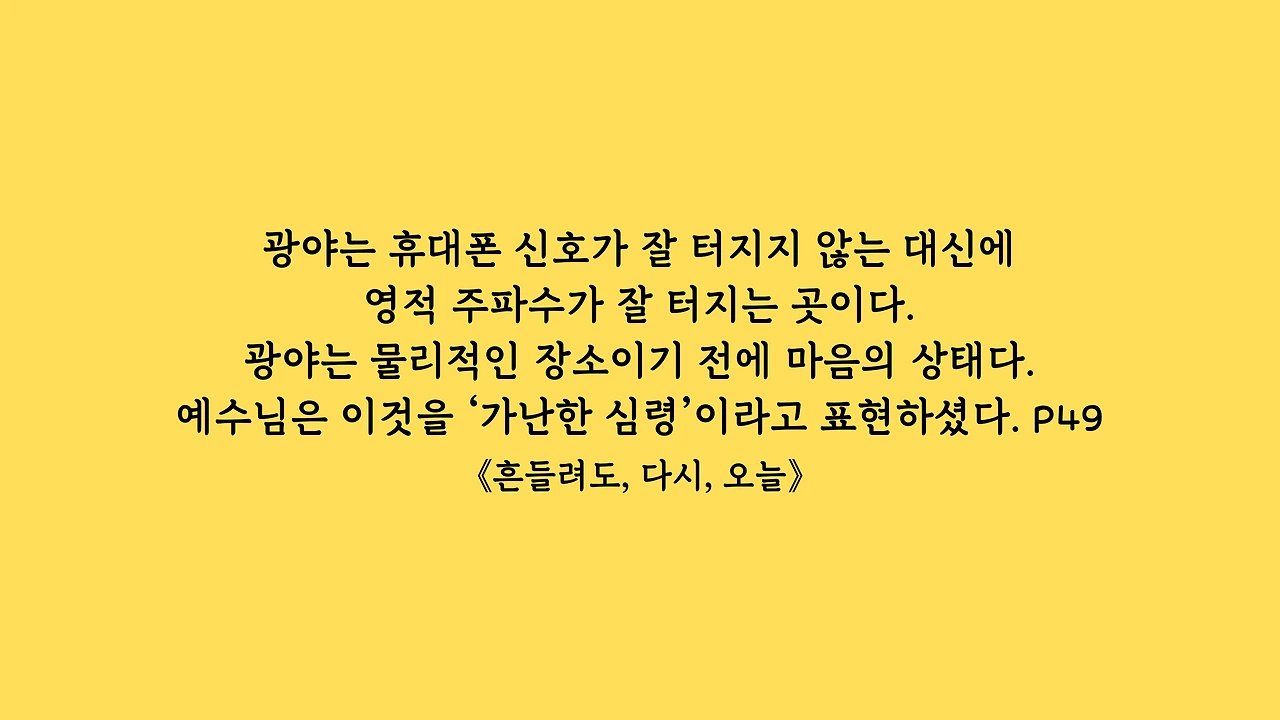 광야는 휴대폰 신호가 잘 터지지 않는 대신에 영적 주파수가 잘 터지는 곳이다. 광야는 물리적인 장소이기 전에 마음의 상태다. 예수님은 이것을 ‘가난한 심령’이라고 표현하셨다. (49)
