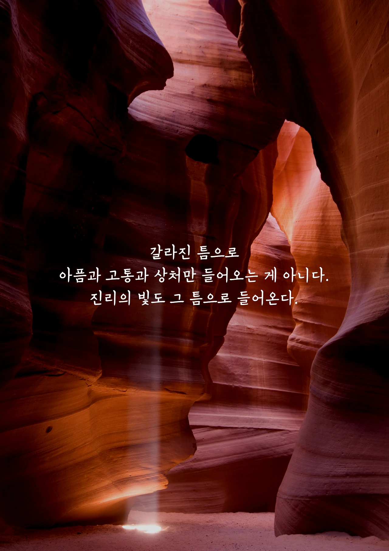 결핍하면, 요한복음 4장의 사마리아 여자가 생각난다. 그녀도 구멍 난 인생을 살고 있었다. 사람들과 어울리지 못했고, 늘 도둑고양이처럼 눈치 보는 인생을 살고 있었다. 살아도 사는 게 아니었다. 우물은 그녀가 목마름 속에 살고 있었다는 걸 보여준다. 무슨 이유에선지, 그녀는 여섯 번째 남자와 살고 있었다. 뜨거운 대낮에 물을 길으러 나온 것도, 사람들의 시선이 부담스러웠기 때문이었다. 평생 이렇게 살 수 없었지만, 그렇다고 딱히 대안이 있는 것도 아니었다. 그러다 우연히 야곱의 우물에서 예수님을 만난다. 그녀에게는 ‘우연히’였지만, 예수님에게는 ‘일부러(요4:4)’였다. 본래 유대인들은 이방인의 피가 섞인 사마리아 사람들을 개돼지 취급했다. 그 지역을 통과하는 건 유대인으로서 신앙 자존심이 허락하지 않았다. 하지만 그녀는 생수이신 예수님을 만나면서 목마름을 해결한다. 구멍 난 인생이, 예수님으로 채워진 것이다. 이는 줄줄 새는 구석을 더는 때우지 않아도 된다는 뜻이었다. 결핍이 해결되지 않으면 감추고 싶은 결함이나 결점이 된다. 반대로 예수님을 통해 건강하게 해결되면, 오히려 간증이 된다. ‘여자의 말이 내가 행한 모든 것을 그가 내게 말하였다 증언하므로 그 동네 중에 많은 사마리아인이 예수를 믿는지라(요4:39)’ 레너드 코헨의 노래 <Anthem>에 보면 이런 말이 나온다. ‘모든 것에는 틈이 있기 마련이다. 빛은 갈라진 틈으로 들어온다.’ 갈라진 틈으로 아픔과 고통과 상처만 들어오는 게 아니다. 진리의 빛도 그 틈으로 들어온다. 예수님이 결핍이라는 틈으로 드나들면, 우리에게 자유가 찾아오는 것도 그런 이유에서다.