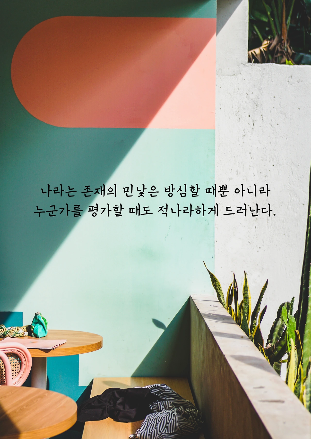 평가는 두 가지를 폭로한다. 평가하는 사람의 실력과 인격을 말이다. 입만 잘 닫고 있어도, 인격자가 된다는 말이 빈말이 아니었다. 사람은 더도 말고 덜도 말고, 딱 자기 수준만큼 이해하게 돼 있다. 그래서 평가하는 것을 보면, 그의 실력을 비롯한 됨됨이를 가늠할 수 있는 것이다. 나라는 존재의 민낯은 방심할 때뿐 아니라 누군가를 평가할 때도 적나라하게 드러난다. 그러나 평가하는 순간, 나 또한 평가받고 있다는 사실을 아는 사람은 드물다. 같은 것도 비꼬는 사람이 있는가 하면, 비교적 좋게 봐주는 사람이 있다. 전자의 경우가 비호감을 산다면, 후자의 경우는 호감을 사는 것 같다. 한 번뿐인 이 세상인데, 비호감으로 살고 싶진 않다. 이번 기회에 다시 마음에 새겨본다. 누군가를 평가하는 동안 나도 평가받고 있다는 걸. 헤아리는 대로 헤아림을 받는다는 걸.