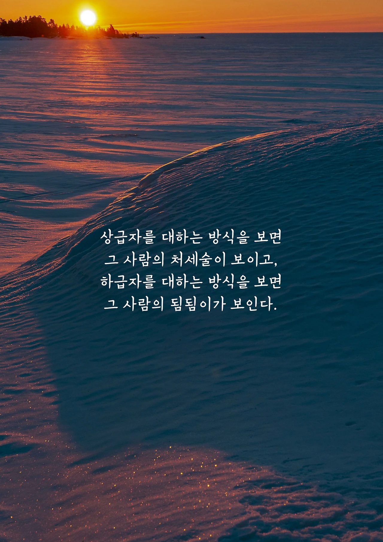 “누군 이 일 안 해 본 줄 알아?” 왕왕 이렇게 말하는 ‘진상 오브 진상’이 있다. 나는 이런 사람이 제일 사악하다고 생각한다. 자기의 경험을 이해하는 용도로 선용하지 않고, 쥐어짜는 용도로 악용하니까 말이다. 상급자를 대하는 방식을 보면 그 사람의 처세술이 보이고, 하급자를 대하는 방식을 보면 그 사람의 됨됨이가 보인다. 문제는 처세술을 배우려는 사람은 많아도, 됨됨이를 배우려는 사람은 적다는 것이다. 그래서 능력 많은 진상이 많은 건지도 모르겠다. 내가 주위 사람들에게 이로운 존재인지는 잘 모르겠다. 그건 내 주변 사람들이 판단할 문제다. 적어도 해로운 존재는 되지 않아야겠다고 결심해 본다.