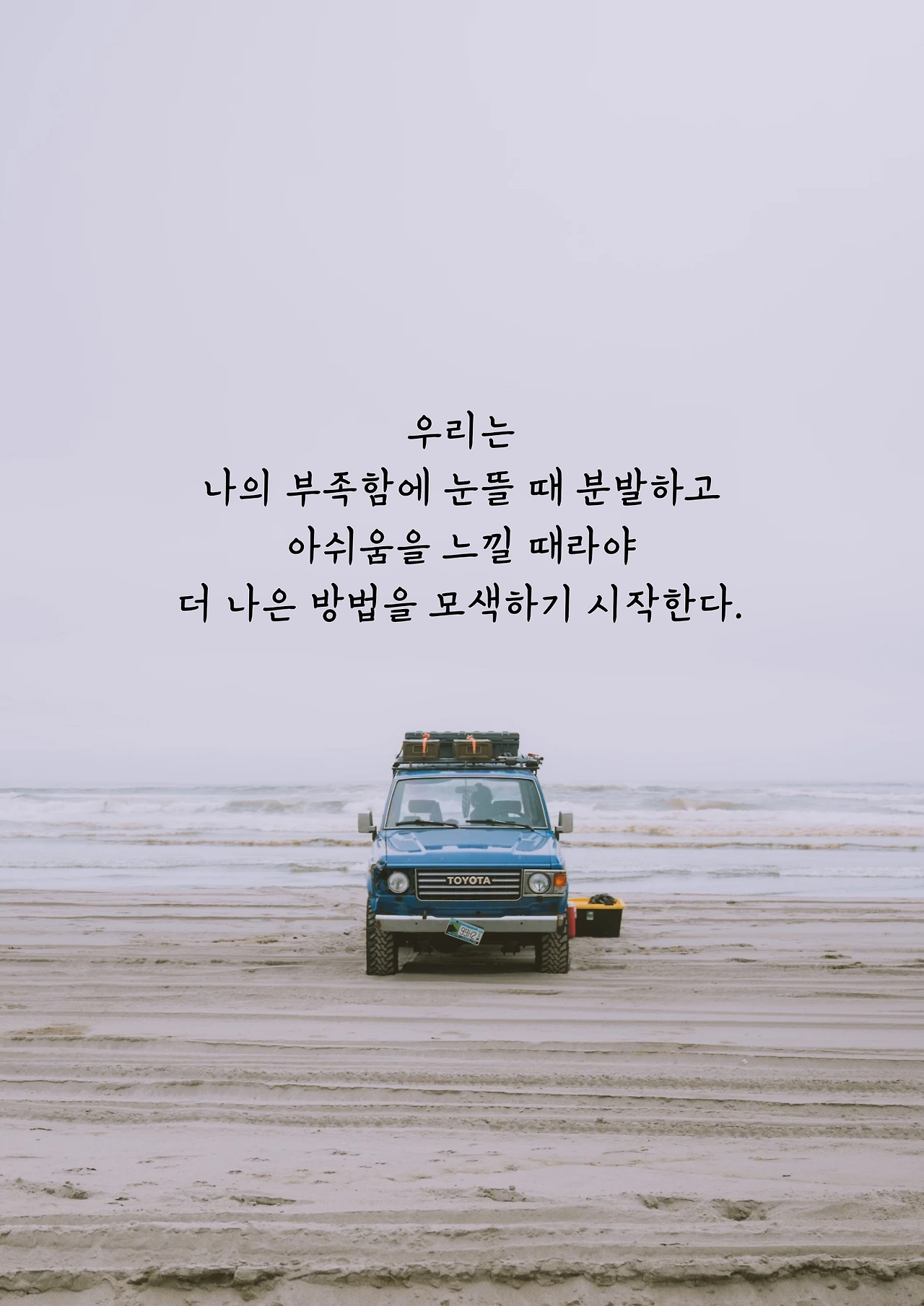 자신을 못살게 굴지 않은 이상, 더러는 부족함과 아쉬움을 느낄 필요도 있다. 우리는 나의 부족함에 눈뜰 때 분발하고, 아쉬움을 느낄 때라야 더 나은 방법을 모색하기 시작한다. 결핍 하나 없는 사람도 없고, 좌절 한번 하지 않는 사람도 없다. 전에는 이런 것들이, 내 삶에 불필요한 웅덩이라고만 생각했다. 할 수만 있으면 제거하거나 메우고 싶었다. 그런데 지금은 그런 시도를 멈췄다. 그중에 내가 미처 몰랐던 도약판도 여럿 있었기 때문이다. 한 단계 더 성장하도록 발판과 자극제가 되어 준 것이다. 모자람을 아는 사람이 자라감의 기쁨도 누린다고 생각한다. 그래서 이제는 ‘부족함과 아쉬움’, ‘결핍과 좌절’을 일방적으로 미워하지 않기로 했다.