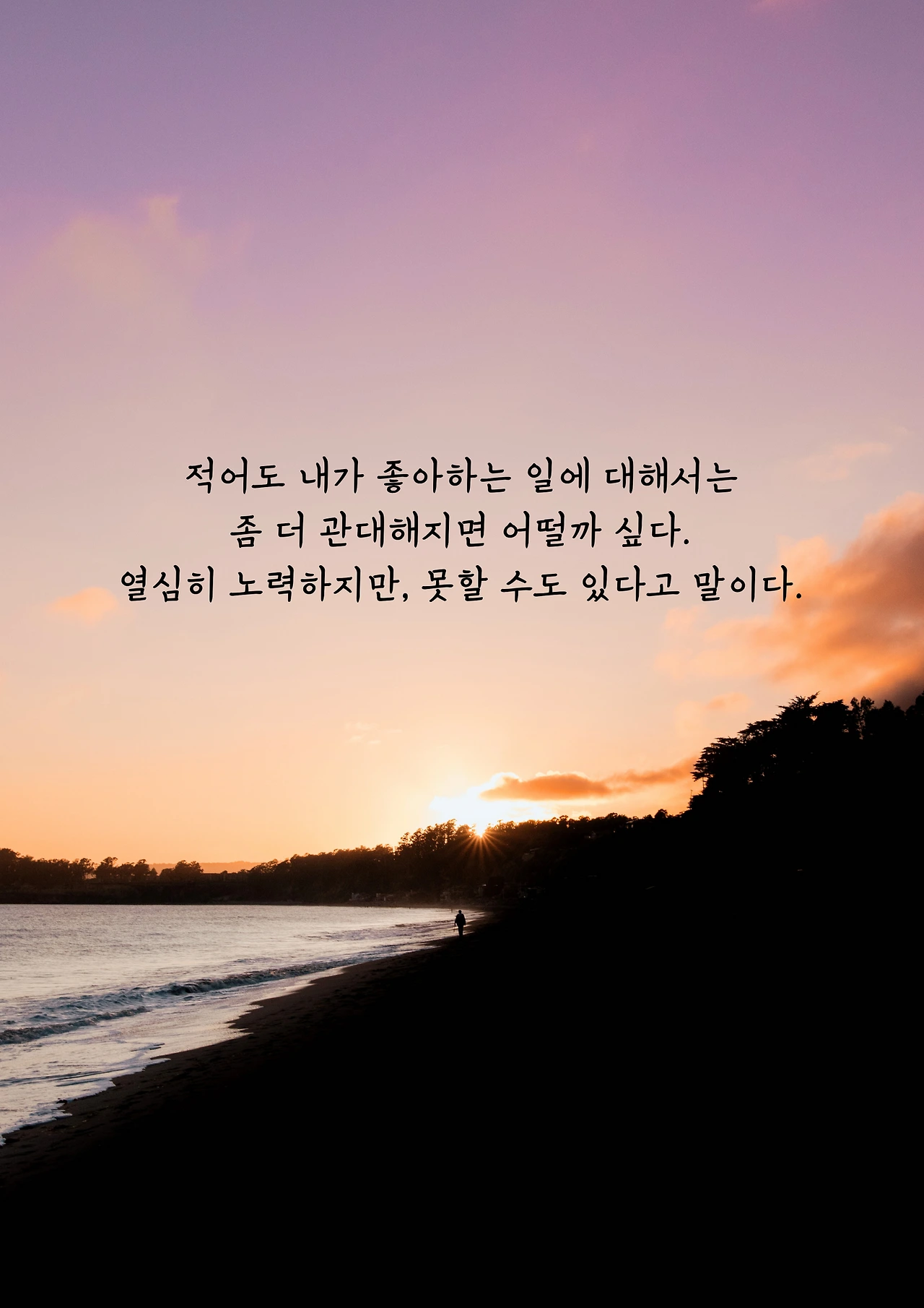 내가 잘하는 것과 좋아하는 것이 일치하면 더할 나위 없겠지만, 이제는 조금 안다. 그게 참 어렵다는 걸. 먹고사는 일 때문에 잘하는 걸 하면서 살지만, 정작 본인은 재미를 잃고 무미건조하게 사는 사람들이 얼마나 많던가. 그렇다면 적어도 내가 좋아하는 일에 대해서는 좀 더 관대해지면 어떨까 싶다. 열심히 노력하지만, 못할 수도 있다고 말이다. 이젠 실력은 별로지만 무언가 좋아서 하는 사람을 보면, 이왕이면 좋은 마음으로 바라보려고 한다. 쉽게 포기해 버리는 세상에서, ‘좋아서’ 열심을 낼 만한 무언가가 있다는 것도 귀한 일이니까.