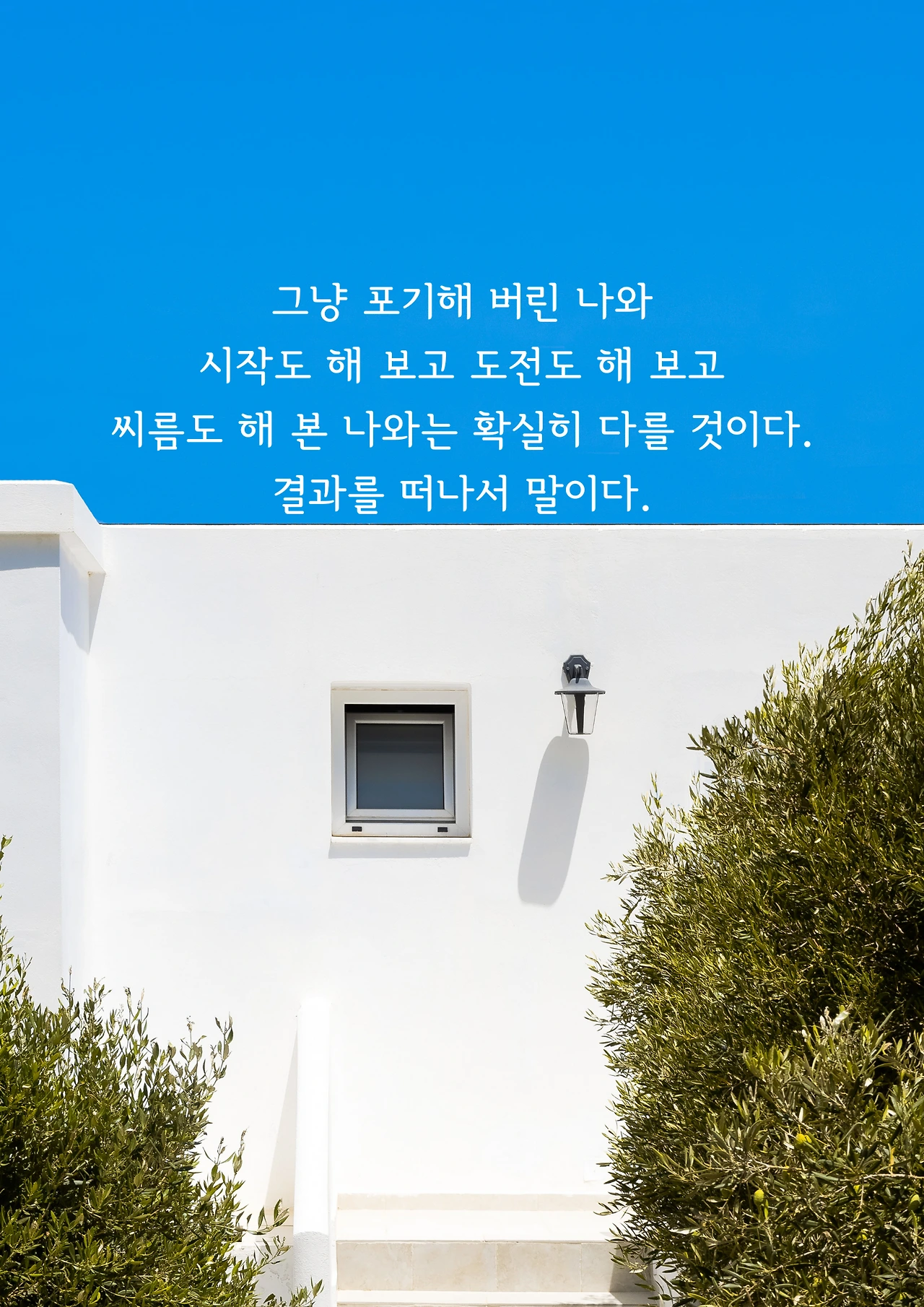 “실수하며 보낸 인생은 아무것도 하지 않고 보낸 인생보다 훨씬 존경스러울 뿐 아니라 훨씬 더 유용하다.” 아일랜드의 극작가 겸 소설가인 조지 버나드 쇼의 말이다. 정말 우물쭈물하다가는 죽도 밥도 되지 않는다. 평생 신세와 팔자만 탓하면서 살게 된다. ‘그냥 포기한 사람, 중간에 그만둔 사람, 시도조차 하지 않은 사람’은 절대 혼자 죽지 않는다. 물귀신 작전으로 나온다. 뭔가 해 보려는 사람까지 가로막으니 말이다. “나도 해 봤는데 안 돼, 그냥 포기해, 네 주제에 무슨” 그래서 나는 해 보지도 않은 사람의 말은 그냥 참고만 한다. 반면 진짜 해 본 사람의 말은 귀담아듣는다. 도전해 본 사람은 일단 도전해 보라고 하고, 포기한 사람은 그냥 포기하라고 말한다. 가만히 보면, 아무것도 하지 않은 사람은 입으로 말만 한다. 그러나 일단 해 본 사람은 삶으로 말한다. “도대체 나는 무엇을 할 수 있을까?”라는 생각에 앞서, 일단 해봐야 한다. 잘하든 못 하든 개의치 말고. 그러다 보면 내 수준과 깜냥도 알 수 있고, 진짜 원하는 게 무엇인지도 확인할 수 있지 않을까?