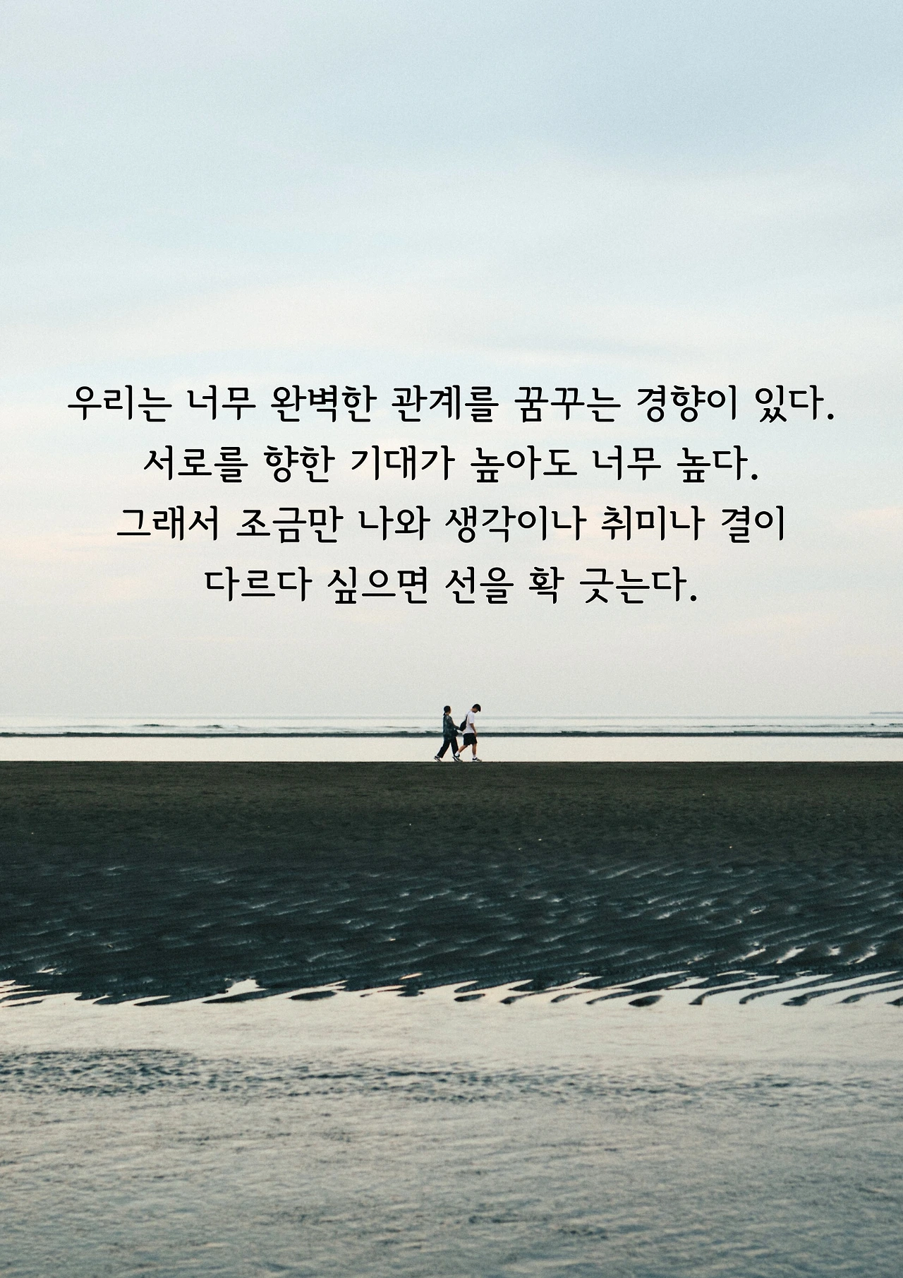 우리는 너무 완벽한 관계를 꿈꾸는 경향이 있다. 서로를 향한 기대가 높아도 너무 높다. 그래서 조금만 나와 생각이나 취미나 결이 다르다 싶으면 선을 확 긋는다. “나랑 안 맞아!” 어쩌면 그런 생각은 섣부른 오판일지도 모른다. 선을 그어놓고, 진가를 알아볼 생각조차 하지 않으니 말이다. 제대로 알기도 전에 아군과 적군으로 분류해 버리면, 과연 남아날 사람이 있을까? 개인적으로 60~70% 정도만 마음에 들어도, 좋은 사람이라고 생각한다. 우리가 만나는 열의 아홉은 50~60% 정도 수준에서 마음에 드는 사람들이다. 하지만 시작은 미약했을지는 몰라도, 서로 부대끼면서 알아가다 보면 관계가 눈부시게 발전하는 사례도 부지기수다. 서로 주거니 받거니 하면서, 점점 70~80% 아니 그 이상으로 마음이 맞는 사람으로 발전해 나가는 것이다. 별 기대하지 않았던 사람과 점점 관계를 발전시켜 나가는 과정은 서로에게 유익하게 작용한다. 이렇게 점점 깊어지는 관계는 쉽게 녹슬지 않는다.