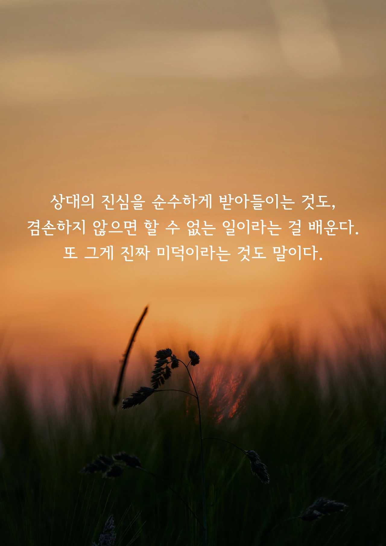 “나는 이래서 안 되고, 저래서 안 됩니다. 저는 그런 사람이 아닙니다.” 누구나 기회를 기다린다. 그러나 그 많던 기회가 어쩌면 겸손을 떨어서 멀리 달아난 건지도 모를 일이다. 이런 기준에서 보면, 그동안 기회를 날려버리고 내던져버린 일만 해도 한 트럭쯤 될 듯싶다. “아, 아까워!” 우리는 다른 사람이 나를 무시하면 발끈한다. 반면 정작 자기가 자신을 무시하고 비하하는 건 대수롭지 않게 생각한다. 자기가 자기 앞길을 가로막는 걸림돌이 된 것도 모르면서 말이다. 이제는 “아휴, 저는 그런 사람 아닙니다.”에서 “그렇게 말씀해 주셔서 감사합니다.”라는 말로 대답한다. 상대의 진심을 순수하게 받아들이는 것도, 겸손하지 않으면 할 수 없는 일이라는 걸 배운다. 또 그게 진짜 미덕이라는 것도 말이다.