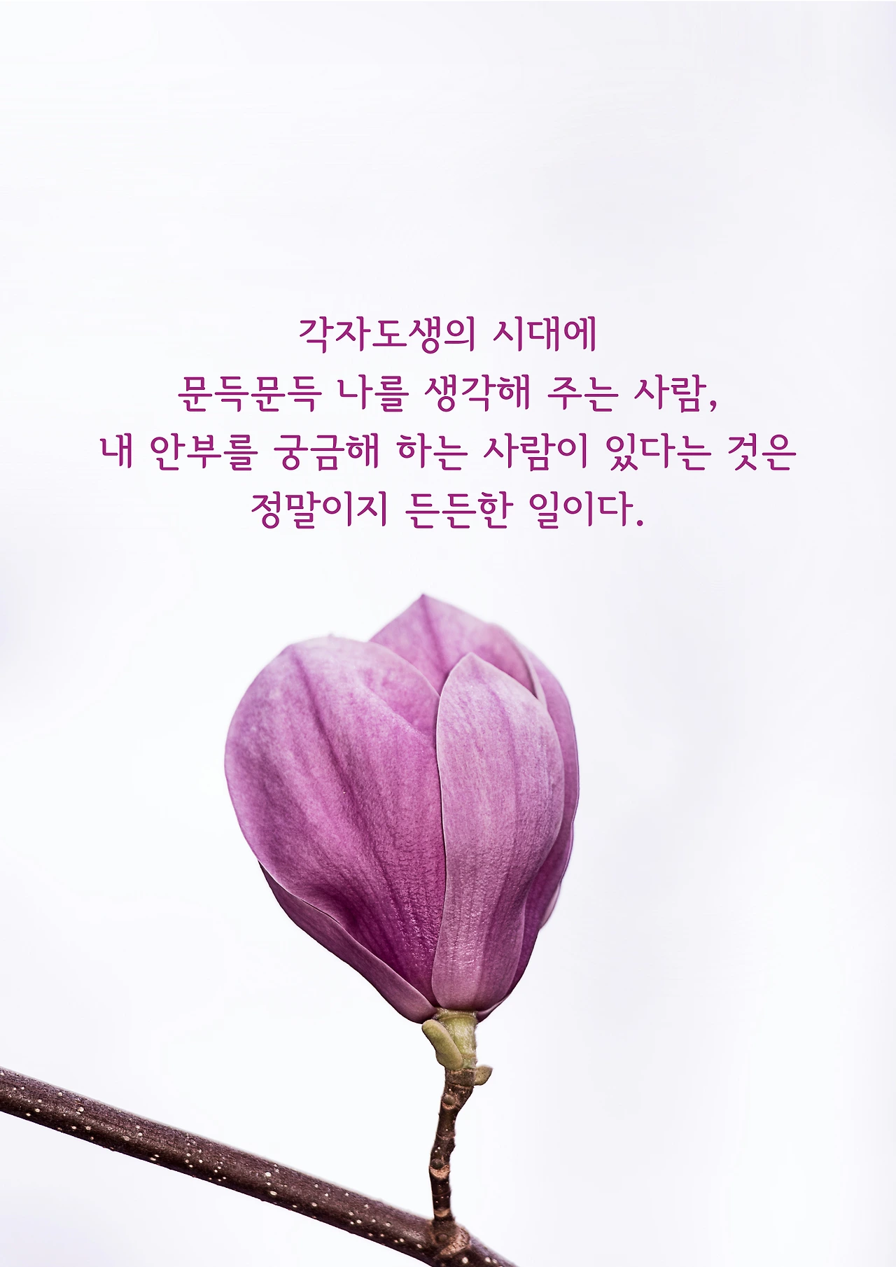 우리의 인생은 무수한 만남으로 이루어진다. 일종의 자만추와 인만추의 콜라보라고나 할까? 그중에는 의도하지 않은 누군가와의 만남도 한몫 차지한다. 내가 전혀 계획하지도 않았고 의도하지도 않았던 만남인데, 그걸 계기로 평생의 친구 혹은 배우자를 얻는 일도 빈번하다. 아무 목적 없이 우연히 만나게 되었는데 평생의 동반자를 얻은 것이다! 시성비를 따지는 분초사회에서는 분명한 목적과 용건이 있어야 한다. 그렇지 않으면 ‘용건만 간단히’라는 눈총을 받아야 한다. 자만추와 인만추 가운데 어느 쪽이 더 낫다고 말하고 싶은 게 아니다. “그냥 생각나서 전화했어. 요즘 어떻게 지내? 오늘이나 내일 잠깐 만날래?” 이런 유의 반가운 말과 만남이 차츰 자취를 감추는 게 두려운 것이다. 문득문득 엄마가 생각나서 전화하는 거랑 평소에는 연락도 없다가 급전이 필요할 때만 전화하는 거랑은 질적으로 다르다. 꼭 용건이 있어야만 연락하고 만남을 추구하는 건, 비즈니스와 별반 다르지 않다. 이런 연락과 만남이 반가울 리 없다. 어쩌면 목적 없는 연락과 만남이 인간성 상실을 막아줄지도 모른다. 각자도생의 시대에 문득문득 나를 생각해 주는 사람, 내 안부를 궁금해 하는 사람이 있다는 것은 정말이지 든든한 일이다. 흉흉한 소식이 들려오는 요즘, “그냥 생각나서 전화했어. 어떻게 지내? 한번 볼까?”라는 집밥 같은 말이 그립다.