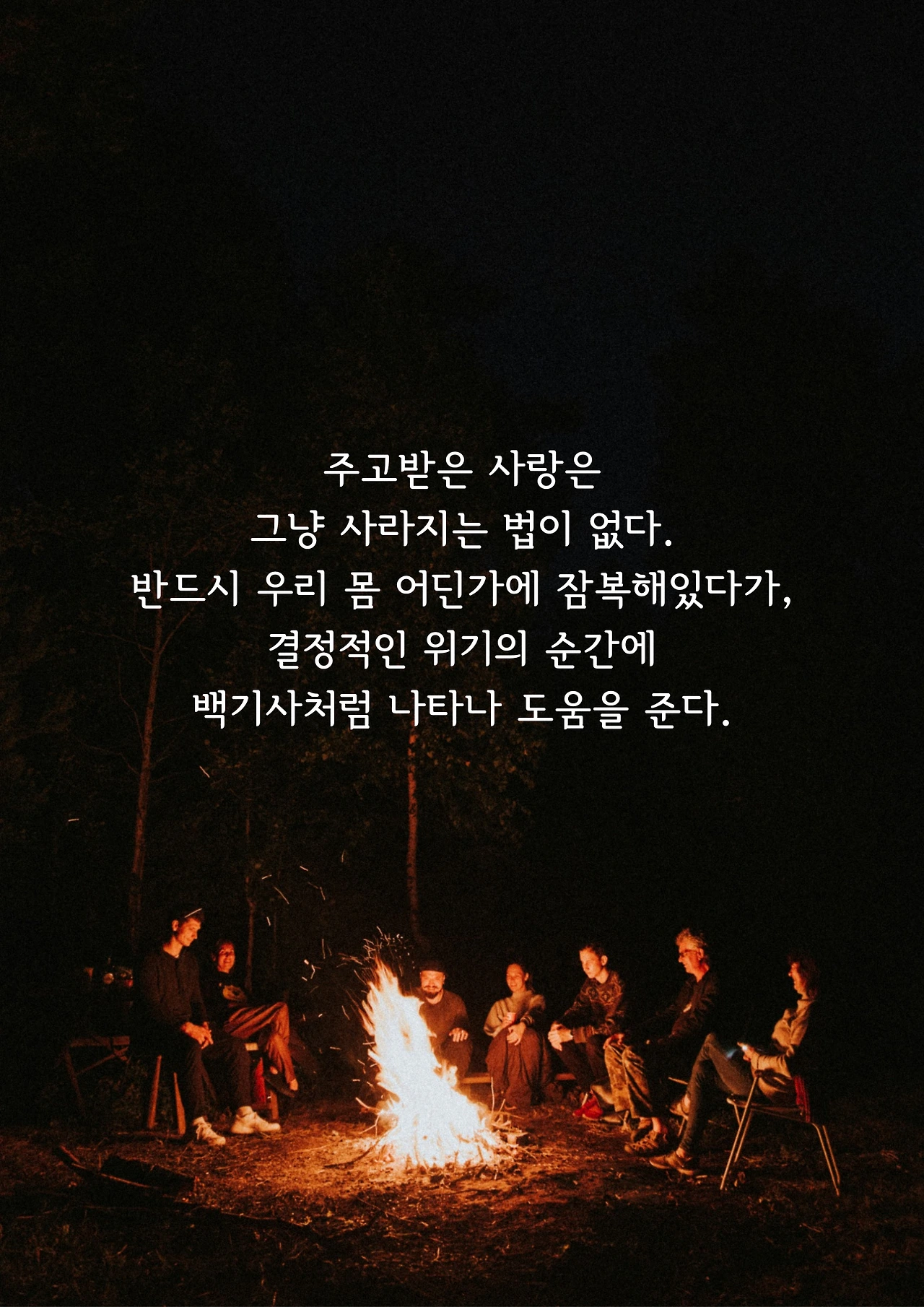 누구에게 하소연할 수 없을 때, 억울하고 분할 때, 다 포기하고 싶을 때, 그냥 멀리 도망치고 싶을 때가 불시에 찾아올 때가 있다. 이때마다 내게 사랑과 ‘그럼에도 불구하고’ 믿어주었던 분들을 떠올렸던 것 같다. 한때는 내가 잘나서, 내 실력과 능력과 지혜로 그 고비를 넘었다고 생각했다. 물론 나도 살려고 몸부림을 많이 쳤다. 그런데, 지금에 와서 돌아보니, 그토록 추운 시절을 나로 버티고 견디고 통과하게 했던 것은 다른 게 아니었다. 사랑과 믿음의 추억들이었다. 그러고 보면, 시간이 흘러도 쉽게 사라지지 않는 것 중에 으뜸은 단연 사랑이 아닌가 싶다. (사실 사랑과 믿음은 단짝이다!) 누군가에게 받은 사랑이든, 누군가에게 준 사랑이든, 주고받은 사랑은 그냥 사라지는 법이 없다. 반드시 우리 몸 어딘가에 잠복해있다가, 결정적인 위기의 순간에 백기사처럼 나타나 도움을 준다.