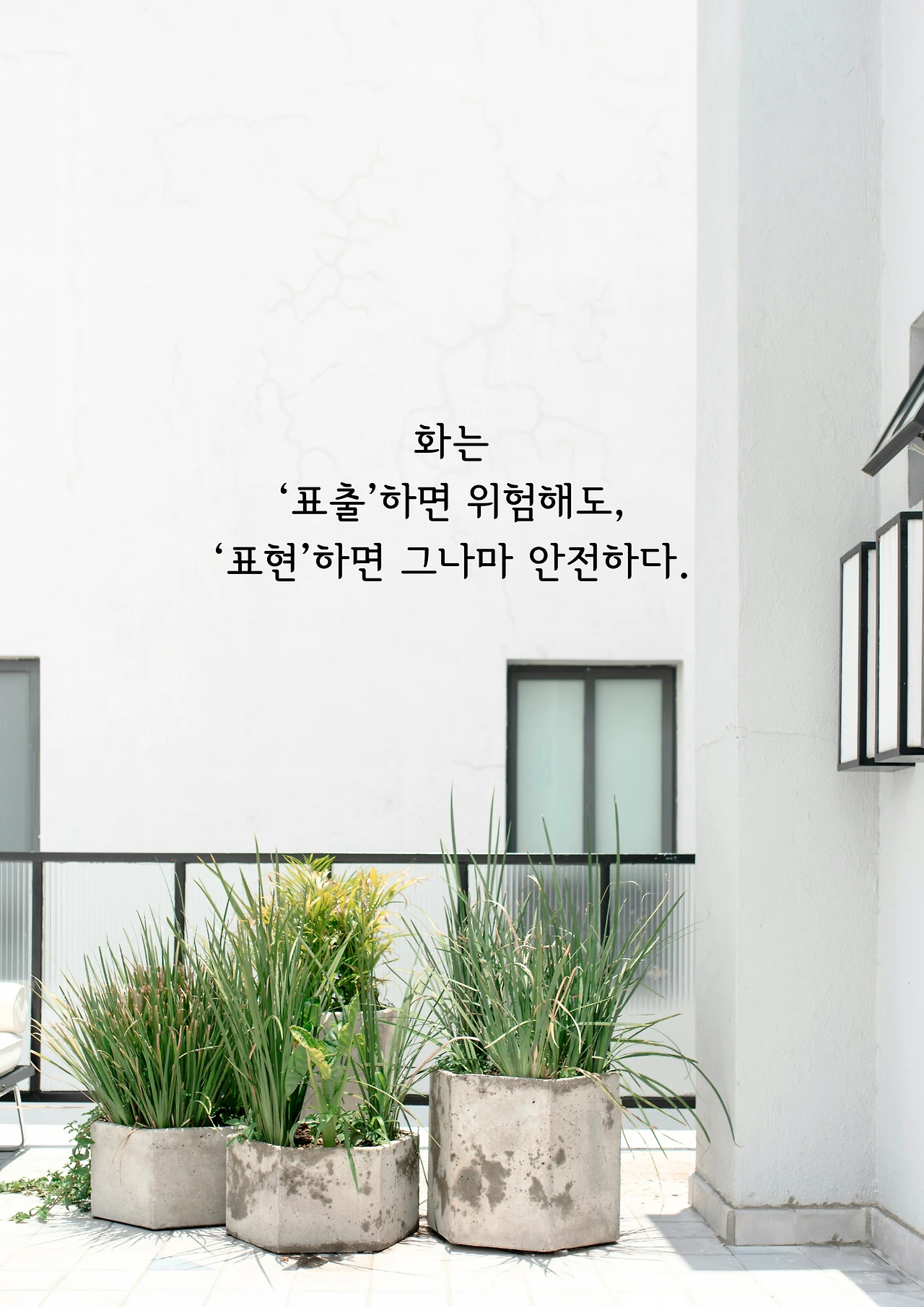 화를 밖에서 터뜨리는 것도, 안으로 삭이는 것도 내 권리이자 선택이다. 그런데 화는 반드시 분노를 동반한다. 그래서 나름 괜찮았던 사람도 기어이 잔인한 인간으로 만들어 버린다. 분명한 건, 화를 낼 권리가 있다고 함부로 잔인하게 굴 권리까지 있는 건 아니라는 것이다. 이것을 간과하면 ‘눈에는 눈, 이에는 이’로 맞대응하게 된다. 화는 눈을 가린다. 그래서 뵈는 게 없게 한다. 아마도 우리가 잔인해진다면 이때가 아닐는지. 우리는 잔인한 인간이 되지 않기 위해서라도, 화를 표출하기보다 표현하기를 힘써야 한다. 그럴 때 우리는 잔인해지려는 결심을 철회하고 나를 지킬 수 있다. 더 나아가 삐뚤어지려는 독한 마음을 포기하고, 누구도 해치지 않는 안전한 인간으로 살아갈 수 있다.