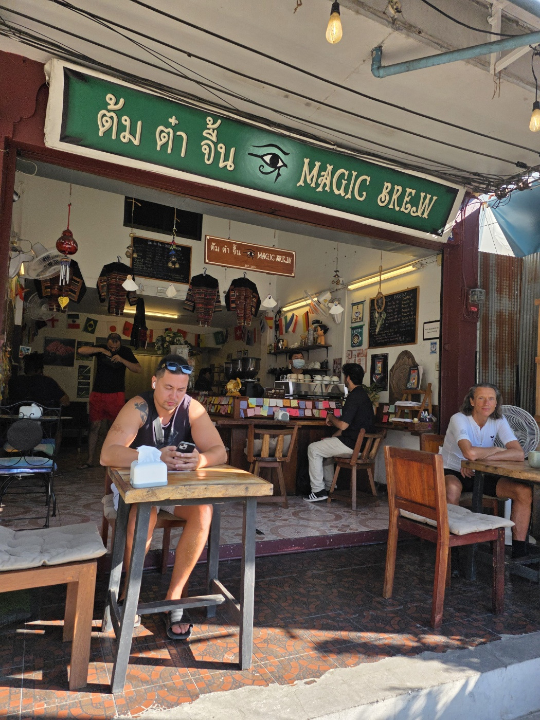 테니스 레슨을 마치고 근처 카페에 들렀다. 이름은 Magic Brew. 커피 트럭으로 시작해 매장으로 확장됐다는 이야기가 있는, 산티탐에서 유명한 카페다. 혼자 책을 읽는 사람, 길 건너를 바라보며 시간을 보내는 사람, 삼삼오오 모여 낮은 목소리로 이야기를 나누는 사람들이 자연스럽게 섞여 있다. 누가 잠깐 머무는 사람이고, 누가 오래 사는 사람인지 쉽게 구분되지 않는다.