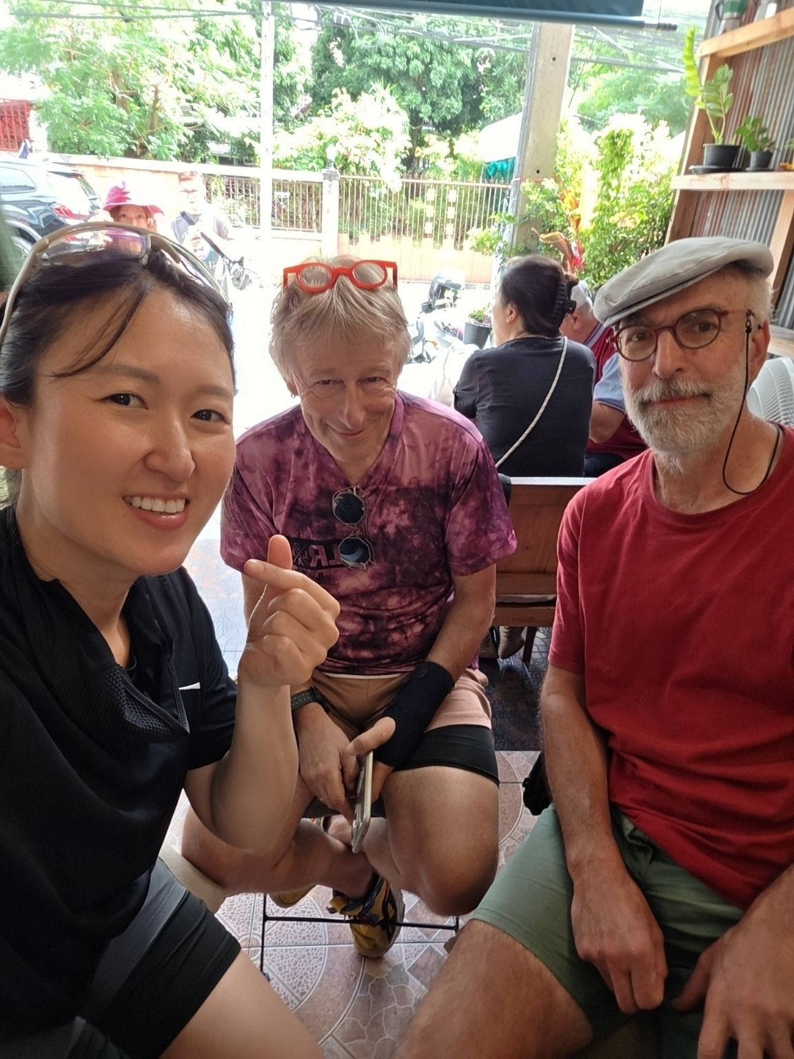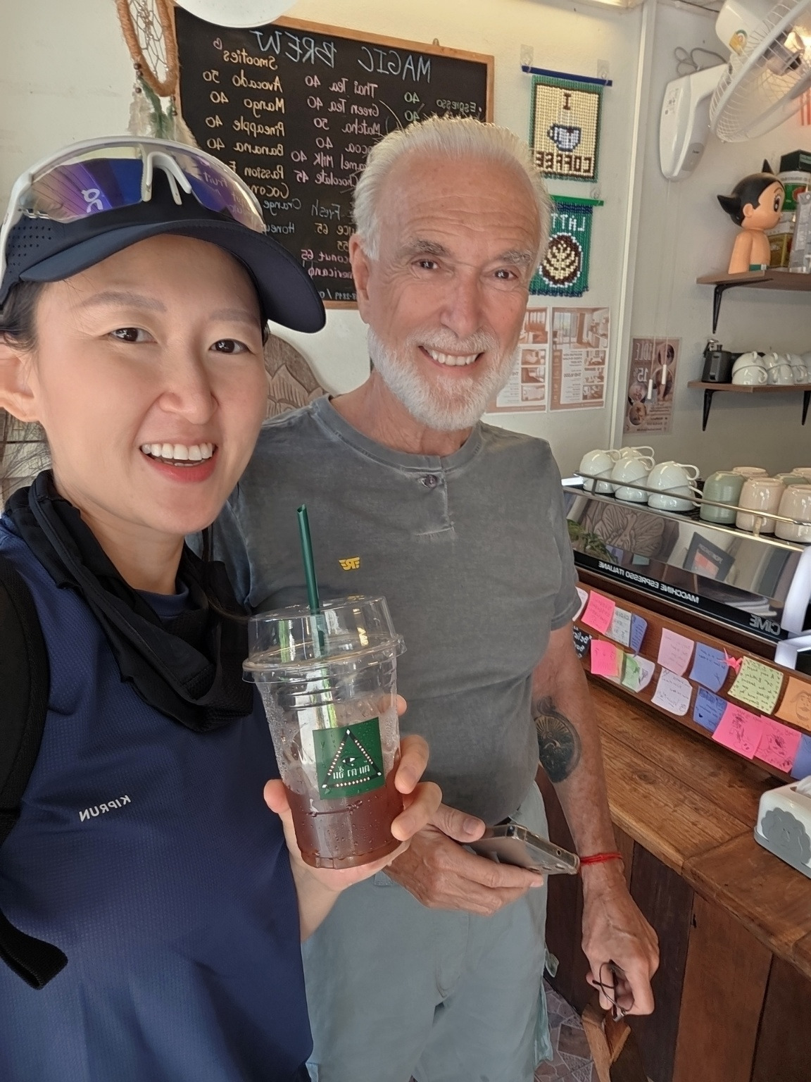 프레드와 에릭은 프랑스에서 자전거를 타고 여행하다가 알게 되었다고 했다. 프레드는 치앙마이로 와서 오래 머물고 있고, 에릭은 일 년에 몇 번씩 이곳으로 여행을 온다고 했다. 최근에 치앙마이 북쪽 온천까지 자전거로 올라갔던 이야기, 도이인타논(태국에서 가장 높은 산)을 넘었던 날의 이야기, 도이수텝(황금 사원이 있는 산)의 일출을 본 이야기까지 이어졌다. 커피는 이미 비어 있었지만 대화는 끊기지 않았다.