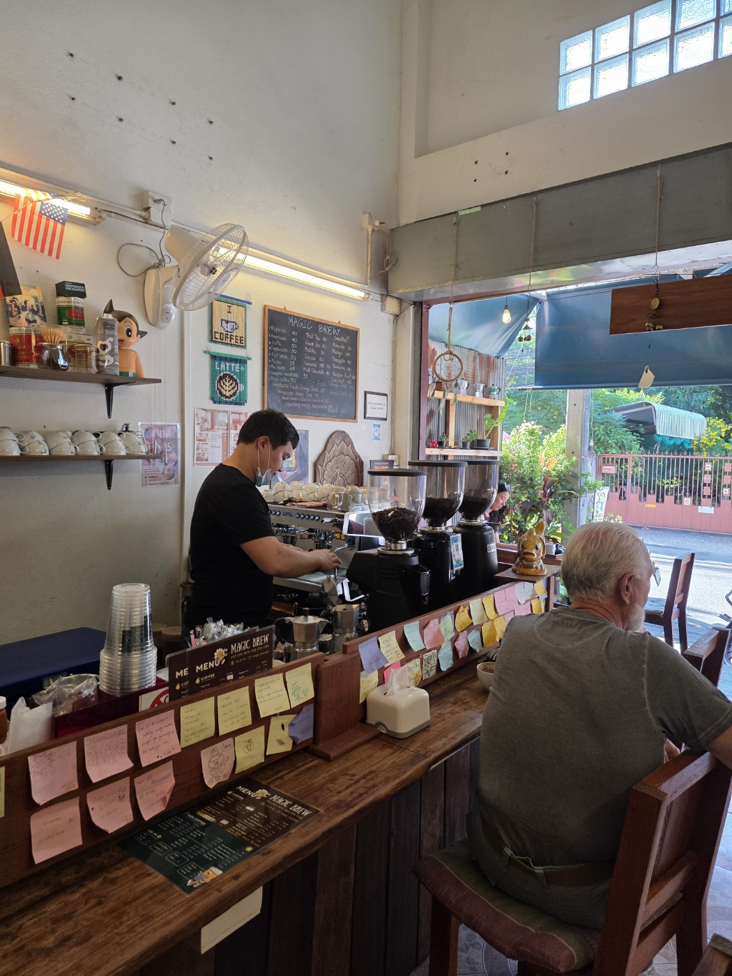 커피도 맛있었지만, 다시 찾게 된 이유는 사장님의 친절 때문이었다. 산미를 좋아하는지, 고소한 맛을 찾는지, 단맛을 선호하는지까지 손님의 취향을 기억하려는 분이다. 첫날 아이스아메리카노를 마셨는데, 두 번째 방문에서도 같은 걸 마실건지 물었다. 오늘은 오렌지커피를 마시겠다고 하자 고개를 끄덕이며 커피를 내려주셨다. 며칠이 지났는데 나를 기억해주시다니! 치앙마이에 단골집이 생긴 것 같아 들뜬 마음으로 바 자리에 앉았다. 공간은 아늑했고, 오래 앉아 있어도 눈치가 보이지 않았다.