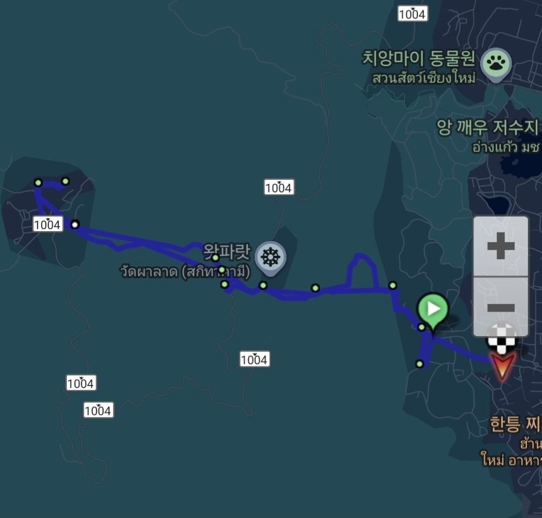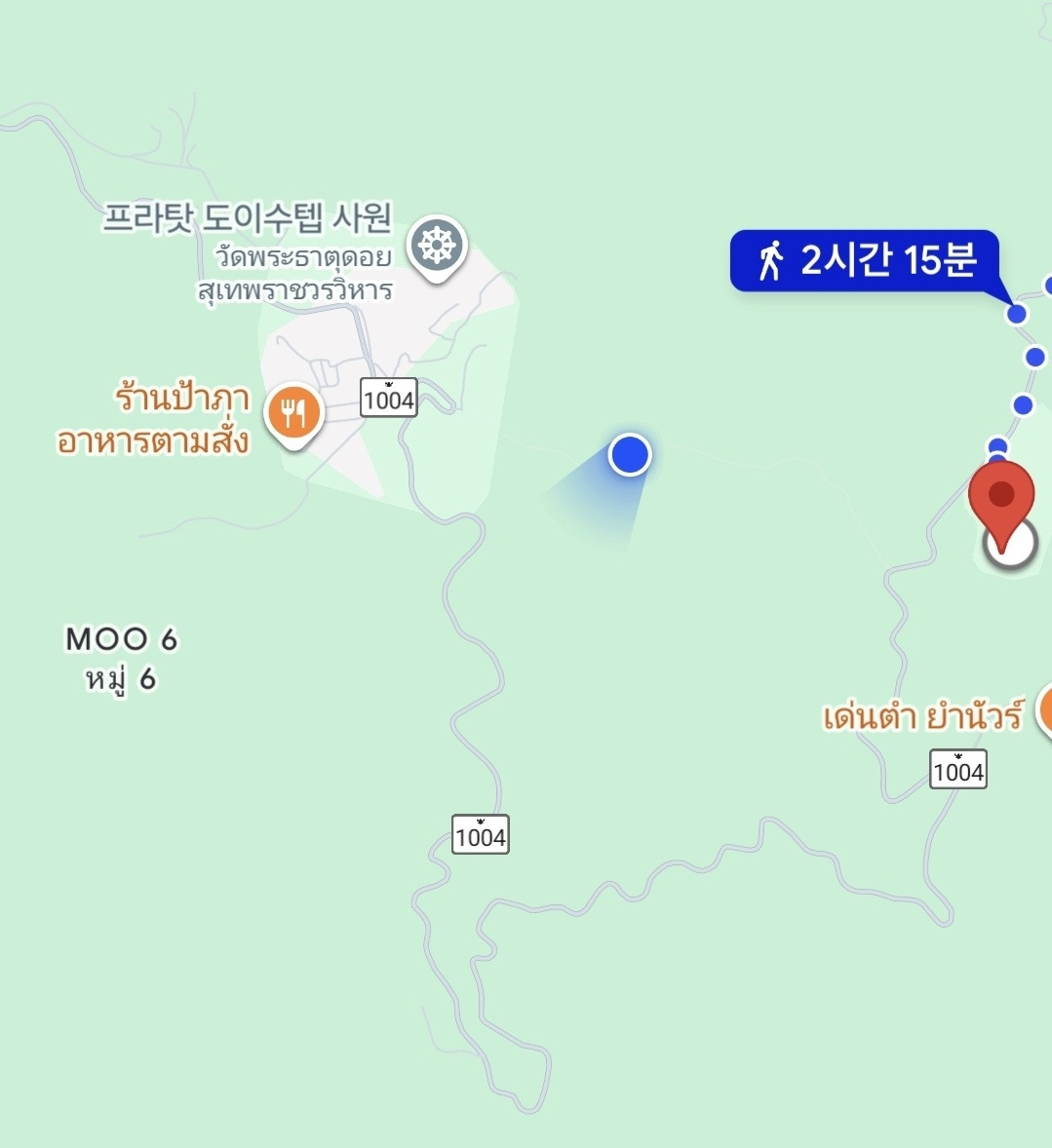힘이 빠질 때면 PK가 태국어로 된 노래를 불렀고, 나는 한국 동요를 불렀다. 왜 하필 곰세마리와 아기상어가 떠올랐지는 알 수 없었다. 신나게 노래를 부르면서 서로의 언어로 된 가사와 리듬에 발을 맞췄다. 구글 지도에도 나오지 않는 길이었고, 의지할 수 있는 건 도이수텝까지의 남은 거리를 나타내는 숫자뿐이었다. 혼자였으면 중간에 멈췄을지도 모른다. 함께여서 힘이 났다. 길을 잘못 들어도 돌아가면 된다는 생각이 들었다. 포기하지 않으면 언젠가 정상이 나올거라고.