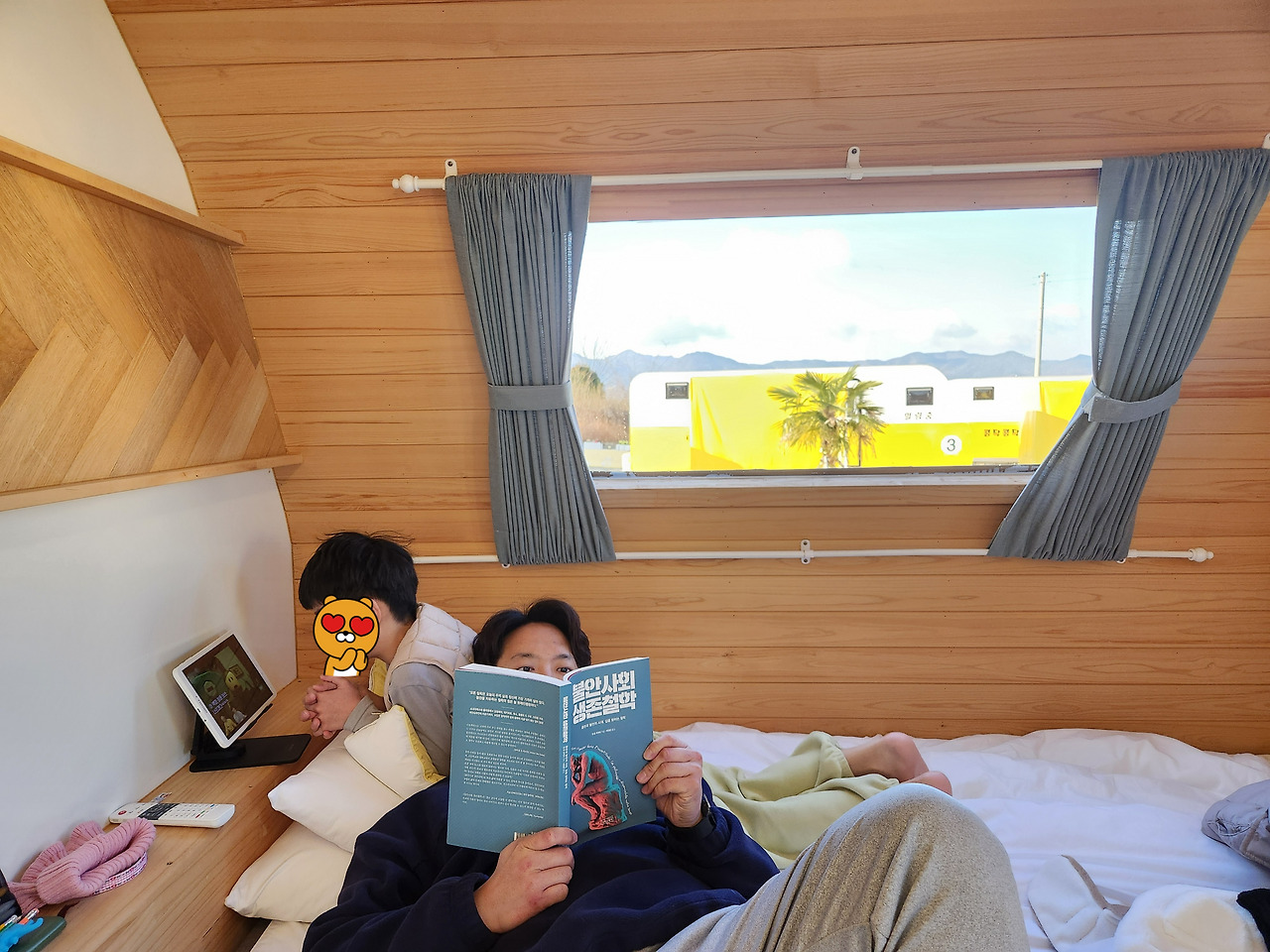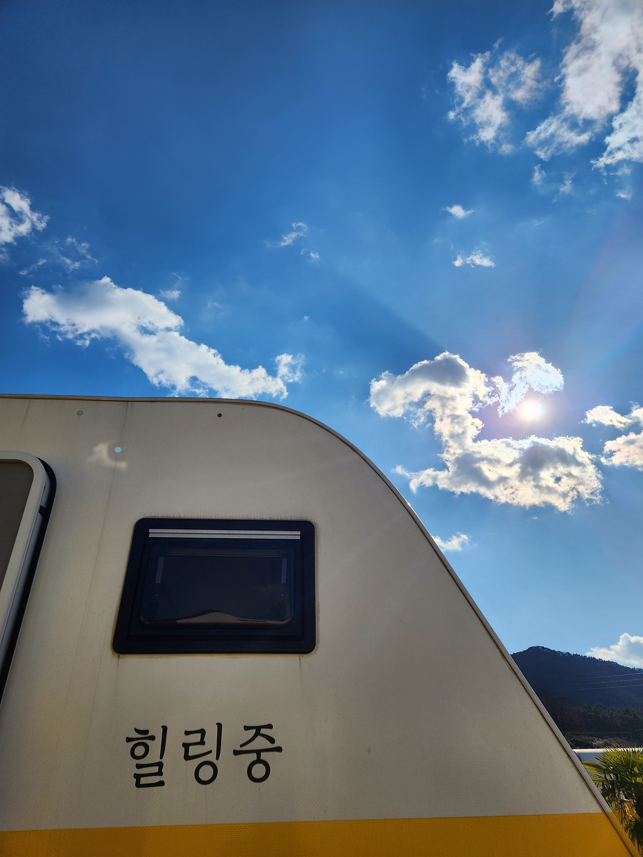 나와 아내는 연말 기념으로 여행을 계획했다. 다행히 우리가 원했던 12월 마지막 주말에 예약이 가능했다. 예약을 완료하고 아이들에게 여행을 간다고 얘기했다. 아이들은 곧바로 수영장이 있는 곳이냐고 물었다. 이번에는 수영장이 있는 곳이 아니라고 했더니 금세 실망한 표정을 지었다. 대신 잠자는 장소가 펜션이 아닌 다른 곳이라고 했다. 아이들은 눈이 땡글해졌다. 펜션이 아닌 곳에서 잠을 잔다는 말이 이상하게 들렸나보다. 나는 아이들에게 이번 여행에서는 큰 자동차에서 잔다고 말했다. 카라반이라는 캠핑용 트레일러가 있는데 거기서 먹고 자며 놀 거라고 덧붙였다. 아이들은 실망했던 표정은 온데간데없이 얼른 가고 싶다며 들떠했다. 아이들의 들뜬 모습에 안심하면서 한편으로는 걱정도 들었다. 나와 아내도 카라반은 사진으로만 접했을 뿐 실제로 가는 건 처음이었다. 사진임을 감안해도 실내가 어느 정도 규모인지 가늠할 수 없어서 혹시나 아이들이 공간이 좁고 불편하다고 할까봐 우려스러웠다. 하지만 걱정은 기우였다.
