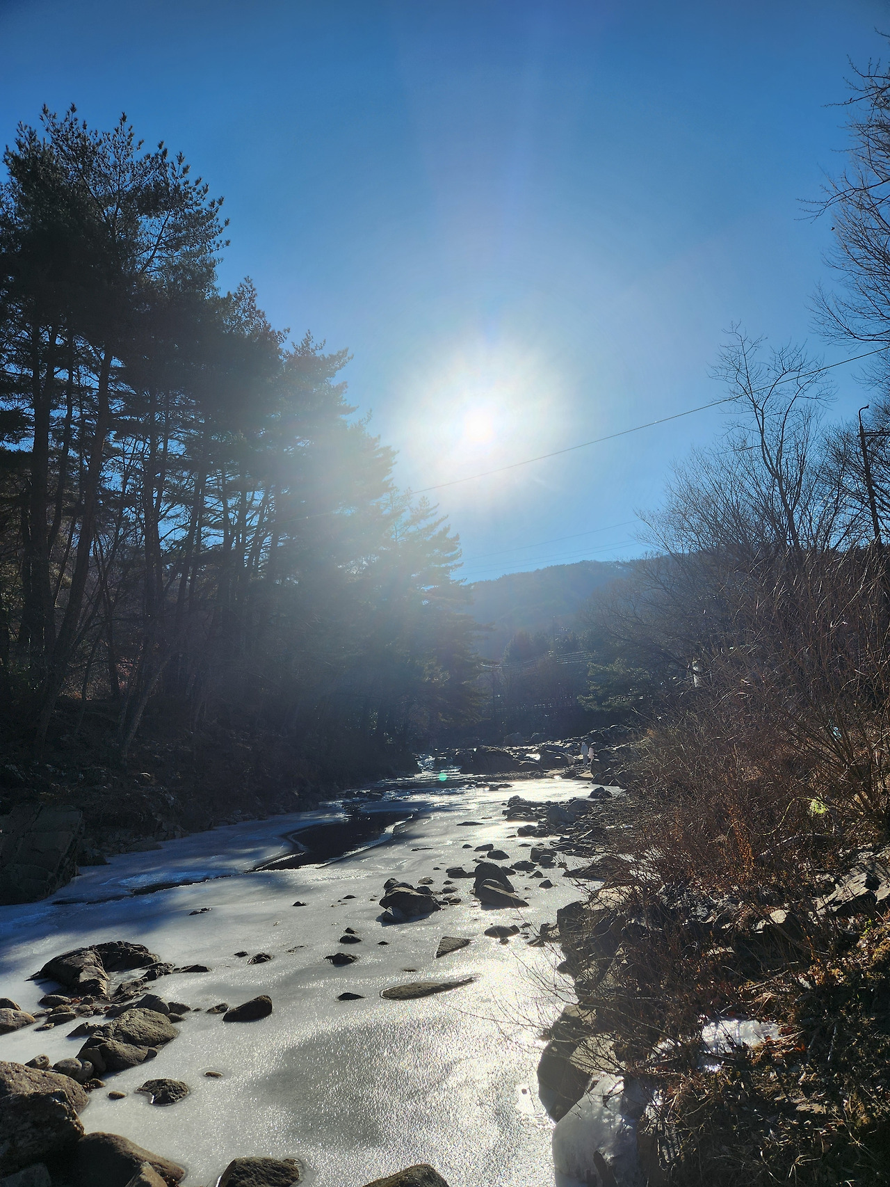 하나로마트에서 고기와 마실거리 등 먹을거리를 넉넉히 사고 숙소로 향했다. 20분만 더 가면 도착이었다. 거리 상으로는 10분 정도면 도착이지만, 여기서부터는 굽이굽이 산길을 따라가야 해서 시간이 더 걸렸다. 아내와 아이들은 추위에도 아랑곳하지 않고 창문을 내렸다. 차갑지만 상쾌한 공기를 계속 맡고 싶으면서 동시에 계곡물이 얼었는지 보고 싶어서였다.