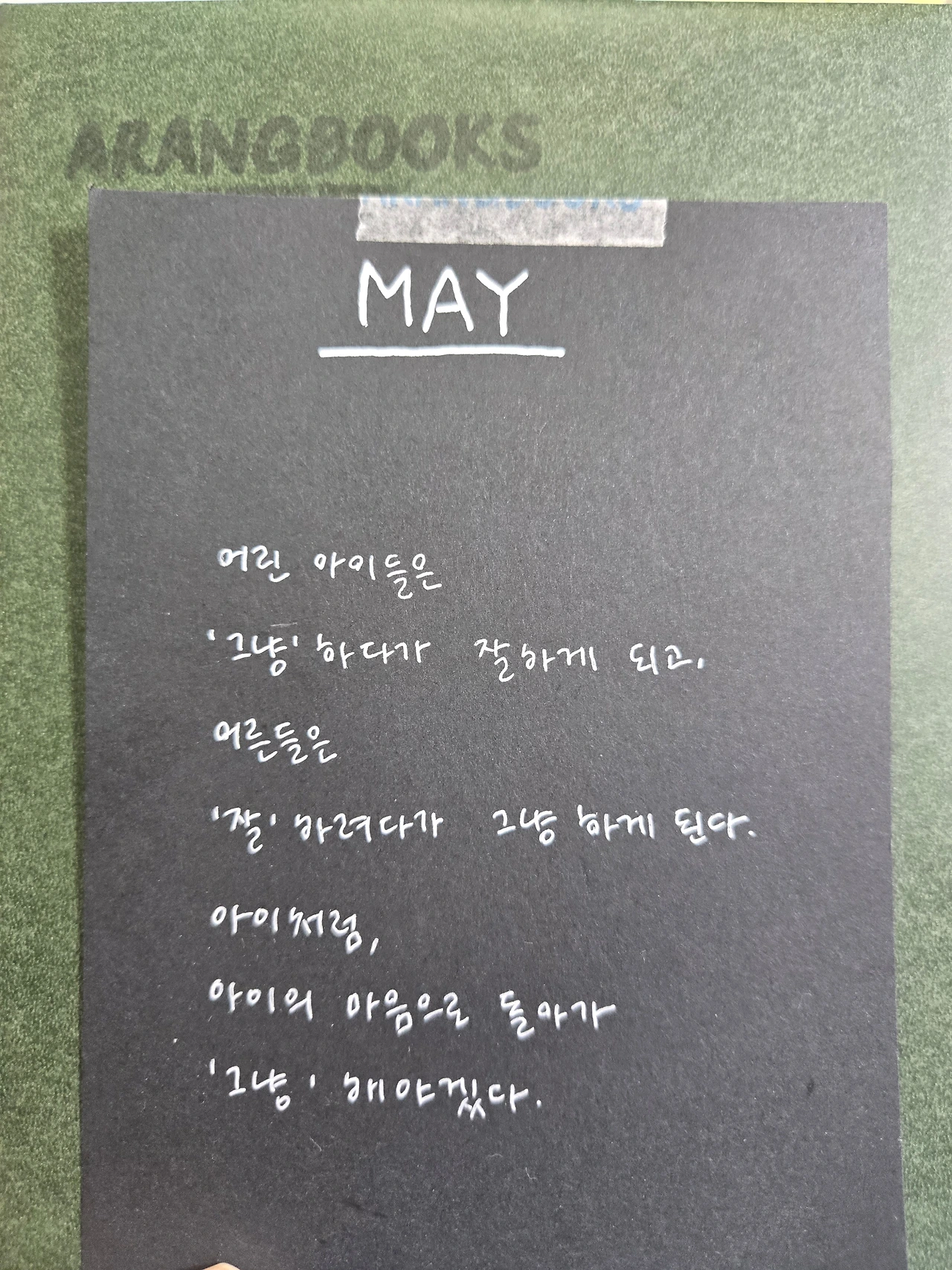 홀가분한 마음으로 독서 모임으로 향했다. 자리에 앉았다. 책장에 진열된 랜덤 북이 눈에 들어왔다. 여기는 지역 독립 서점과 연계해 랜덤 북을 팔고 있다. 그동안 관심 두지 않았는데 한 권이 눈에 들어왔다. 바로 이 책이다. 글귀도 그렇고, 5월이라는 것도 그렇고, 딱 나를 위한 책처럼 보였다. 아직도 포장을 뜯지 않았다. 해낸 나에게 주는 선물로 간직하고 싶은 마음이 더 크다.