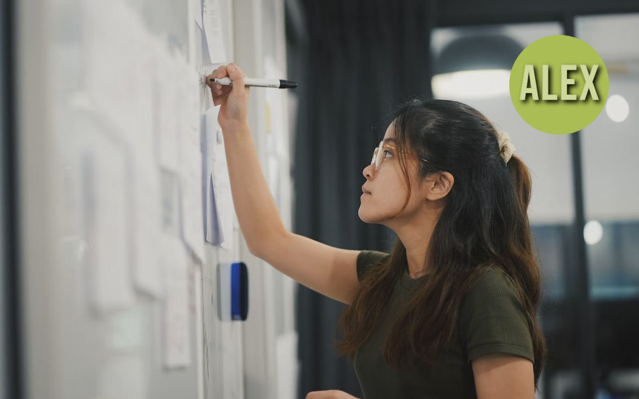직장에서 함께 일하는 동료 Alex를 만났어요. 자기 일에 열심히 집중하고 있는 Alex 곁으로 다가가서 "디자인 일은 잘 돼가고 있어?"라고 안부 인사를 건넸어요. 마치 기다렸다는 듯이 Alex는 보여줄 것이 있다면서 프로젝트 과정 동안 해온 수많은 디자인 자료들과 프로덕트 디자인들을 자신 있게 보여주었어요.