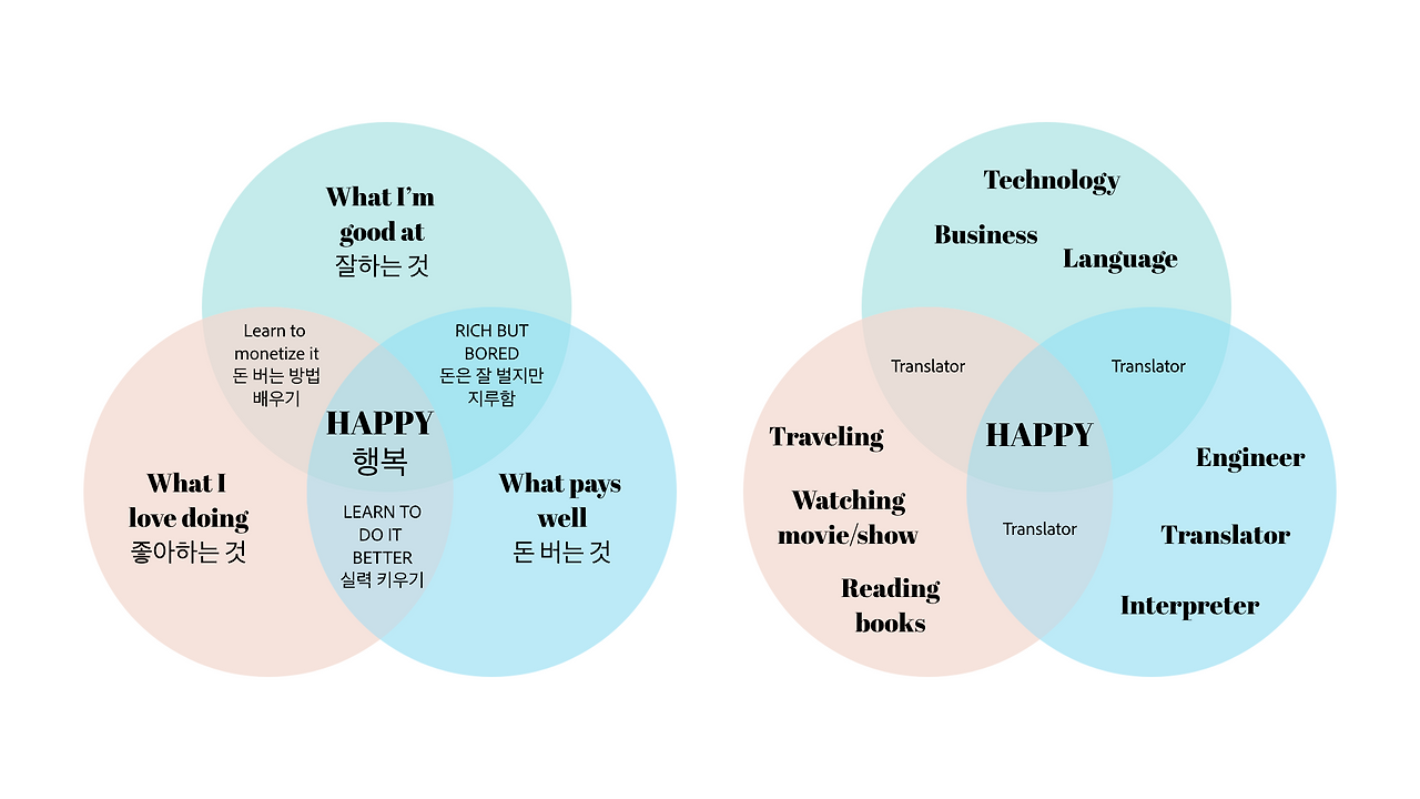 반면에 내가 아닌, 남들이 내게 잘한다고 칭찬하고, 부러워하는 것을 잘하는 것으로 정했다. 예를 들어, 공학 및 기술, 비즈니스, 언어 등이 내가 잘하는 것에 해당하고 이는 모두 객관적이다. 그저 남들이 어떻게 생각하고, 남들의 시선을 신경 쓰는 것이 아니다. 자신만의 세계에 빠져 열심히 하다 보면 결국 남들이 잘한다고 인정하고 부러워하는 부분이 내가 잘하는 것이다.