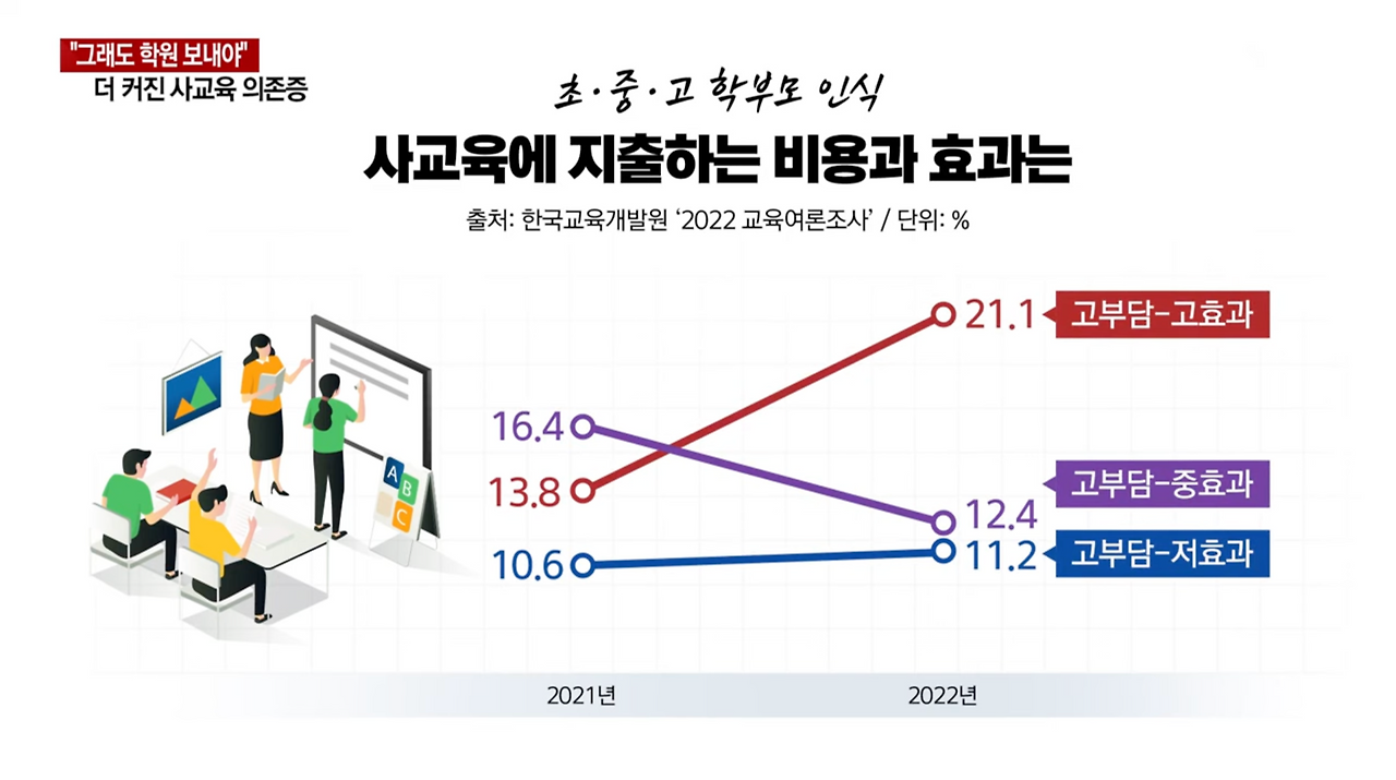 전 세계에서 교육열 높은 나라로 유명한 대한민국에서 높은 사교육비는 사실 어제오늘 문제가 아니다. 위에 그래프에서 볼 수 있듯이, 나라의 경제가 성장하면서 동시에 사교육비 또한 함께 증가해 왔다. 2020년 코로나 대유행 때문에 모든 오프라인 활동을 할 수 없었던 이유로 사교육비가 잠시 줄어들었지만, 2021년 이후에 사교육비는 오히려 더 높게 증가하였다.