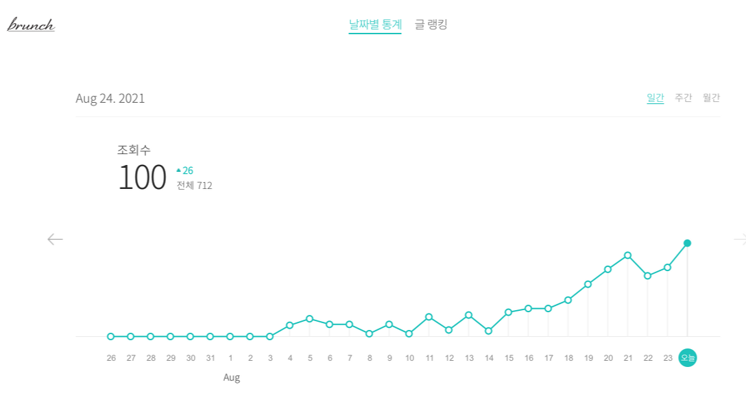 나의 경험과 이야기를 흥미롭게 읽어주시는 독자님들이 한 자리, 두 자리, 그리고 마침내 세 자리 수가 되는 순간이었다. 물론 조회수 100이 누구에게는 크고, 누구에게는 작은 지표일 수 있지만, 사실 나는 처음 조회수 1을 보고 더 큰 기쁨을 느꼈다. 그저 그 누군가 한 명이 내가 쓴 글을 흥미롭게 읽었다는 사실이 즐거웠다.