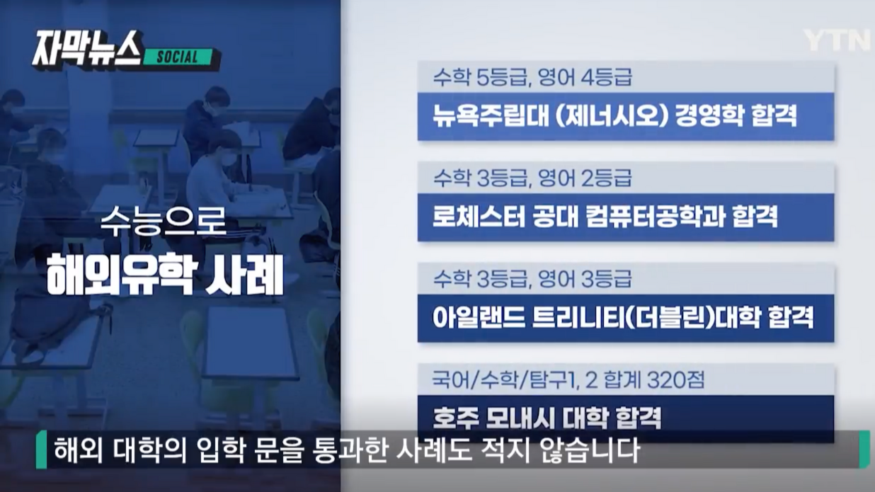 수능 점수로만 뉴욕 주립대 경영학과에 합격한 기사가 유튜브에서 화제가 되었다. 고작 1분 53초 길이의 영상에 불과했지만, 그 임팩트는 하루 사이에 십만 명이 시청할 정도로 강했다. 사실, 수능 점수로 해외 대학교에 입학하는 것은 오래전부터 가능한 일이었다. 하지만, 정보의 격차 때문에 많은 사람들이 몰랐을 뿐, 다행히 이제는 소셜 미디어의 순기능 덕분에 더 많은 사람들이 유익한 정보를 얻을 수 있게 되었다.