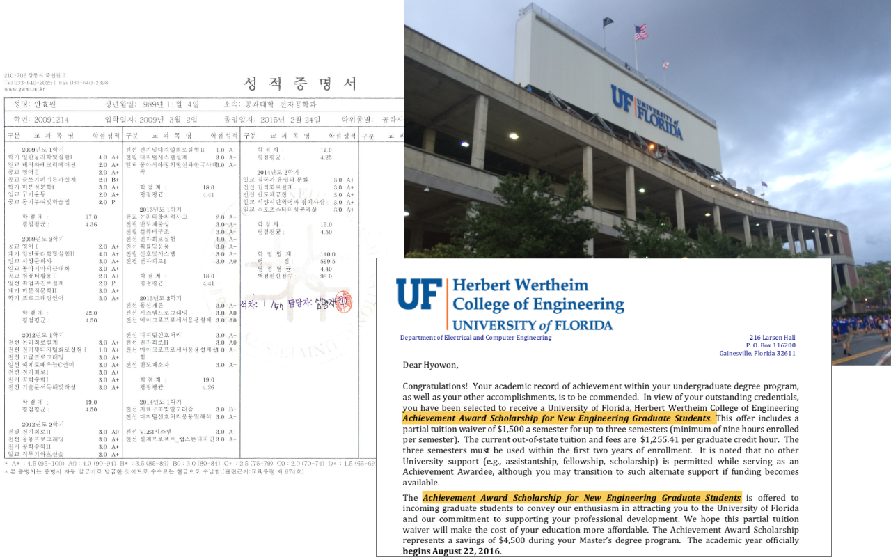 나 또한 내신 성적도 나빴고, 수능 시험에서도 최소 등급을 받지 못했기 때문에 계획했던 대학교에 지원하지 못했다. 당시에 명문 대학교에 가는 것이 유일한 성공의 길이라고 생각했던 부모님 덕분에 재수를 했지만, 이 또한 실패했다. 그래서 결국 상상하지도 못했던 공기 좋고 물 좋은 강원도 강릉에 위치한 강릉원주 대학교에 입학했다. 우연찮게 전자/전기/컴퓨터 전공에 빠져 4년 내내 전액 장학금을 받고, 마침내 공대 수석으로 졸업했다. 대학교 4년 동안 영어 공부도 열심히 하면서 졸업과 동시에 3군데 해외 대학원에서 합격 통지서를 받고, 결국에는 1년 뒤에 입학 장학금을 받고 해외 대학원에 입학할 수 있었다.