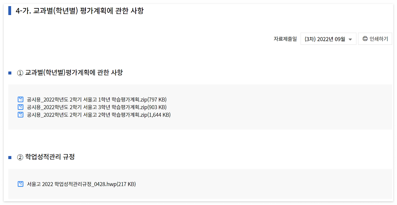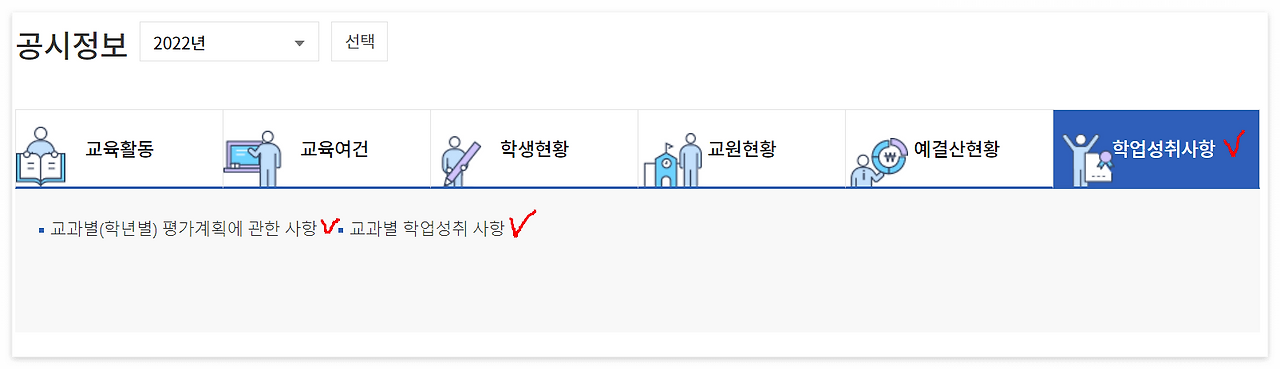 재학 중에 학생들에게 특히 도움이 되는 정보이다. 각 과목별 평가 계획을 세부적으로 확인할 수 있고 수행평가의 평가방법이나 평가기준까지 공시되어 있는 경우가 많으므로 미리 수행평가 내용을 확인하고 내가 지원하는 전공계열에 맞는 세부 주제를 생각하고 관련 독서 등을 대비할 수도 있다.