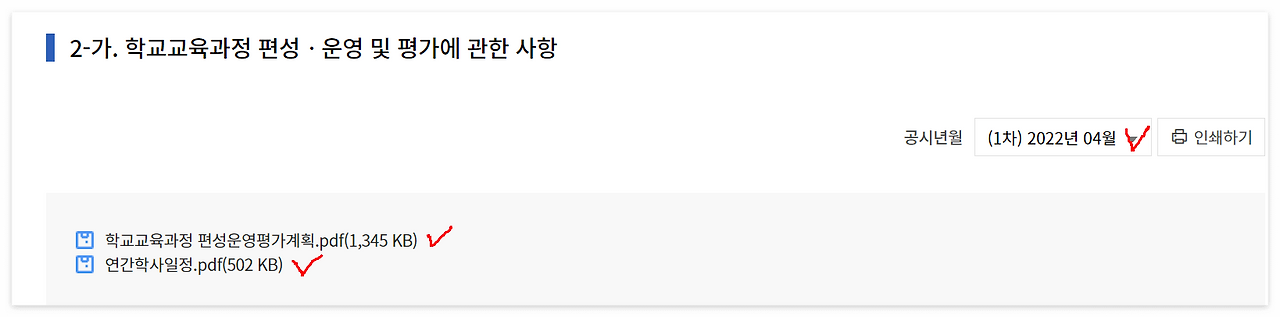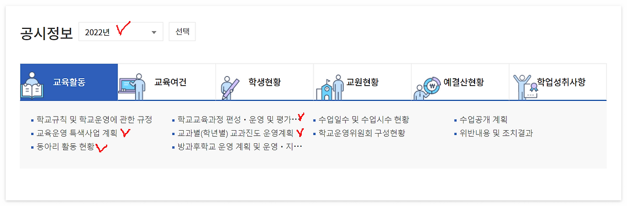 교육활동 탭에는 다양한 학교 교육활동에 대한 정보가 공시되어 있다. 그중에서 학교에 대해서 이해하고 입시에 활용할 수 있는 학교 활동을 확인하기 위해서 아래 표시된 4가지 정보를 확인하는 것을 추천한다.