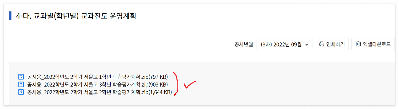 이 부분은 학교에 따라서 교육활동 탭에 있는 교과별(학년별) 교과진도 운영계획과 정보가 중복될 수 있다. 앞서 수행평가 등 상세 평가계획이 없이 진도 계획만 있었다면 여기에서 수행평가 등 세부 평가계획을 확인할 수 있다.