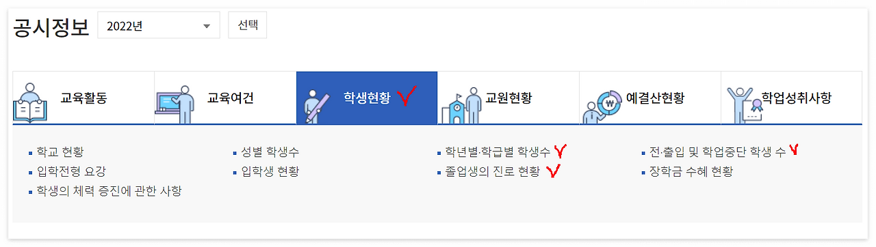 학생 현황을 통해서 생각보다 학교에 대한 많은 정보를 알 수 있다. 예시로 선택한 학교는 일반고등학교이고 평준화 지역이기 때문에 입학전형 요강은 특별히 체크하지 않았지만 별도의 입학전형으로 학생을 모집하는 학교의 경우 입학전형 요강 부분도 확인하면 좋다. 일반고 기준으로는 아래 3가지 정보를 확인해 보는 것을 추천한다.
