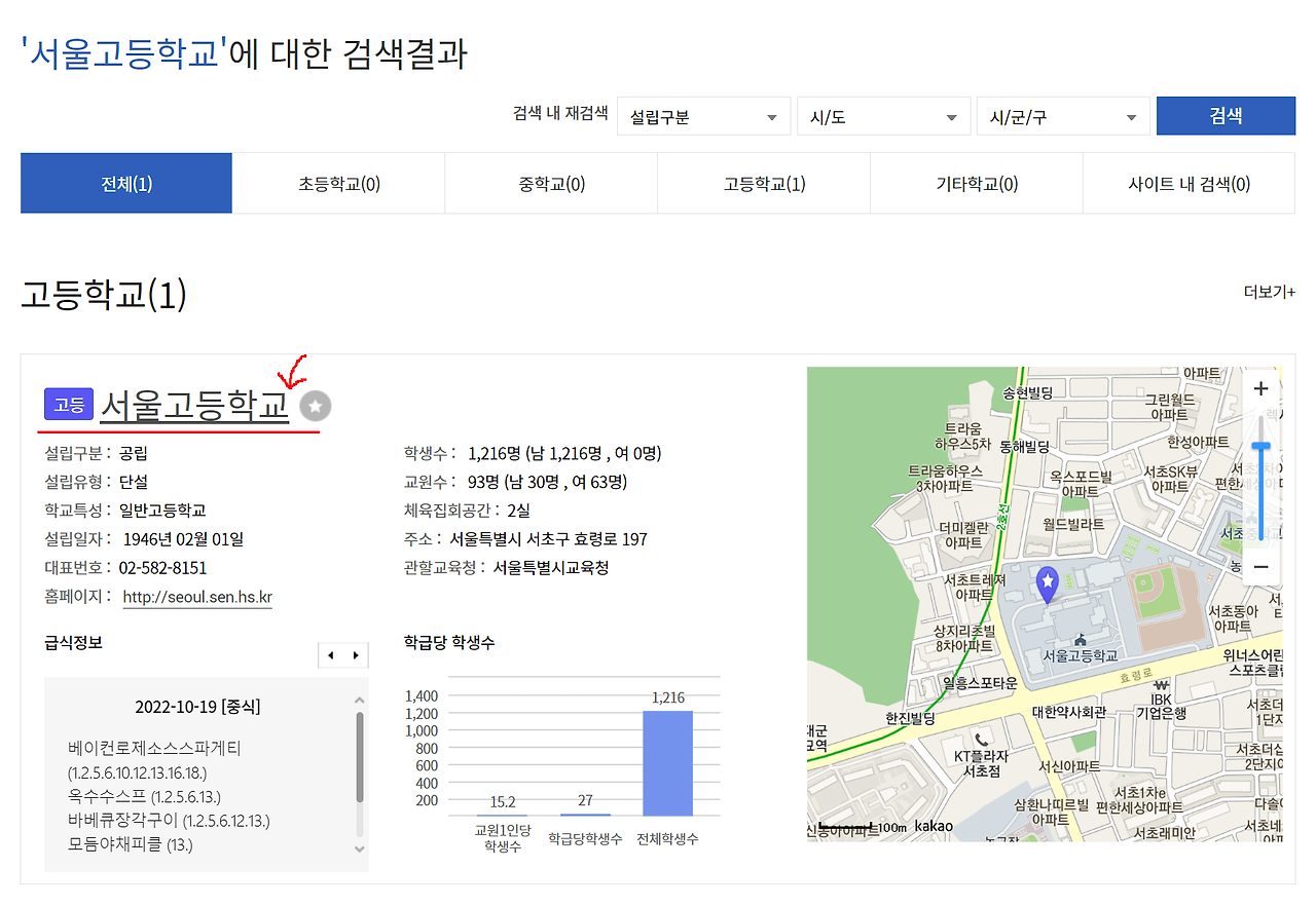 검색을 통해 학교를 찾았다면 위의 학교 이름을 클릭하면 구체적인 정보창이 뜬다