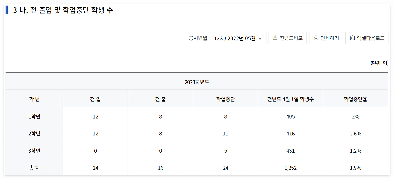 전.출입과 학업중단 학생수는 근처의 다른 학교들과의 비교를 통해 학교 생활의 난이도를 예상하는데 의미 있는 자료다. 전출과 학업중단 학생수는 학교 안에서 내신 성적을 취득하기 어려울 때 그 비율이 높은 경우가 많다. 꼭 그런 이유로 전출과 학업중단을 결정하는 것은 아니지만 상위권이 많이 몰리는 학교의 경우 학교 성적을 받기가 어려워 전학을 결정하거나 아예 검정고시 및 수능으로 입시 전략을 바꿔서 학업중단을 선택하는 경우가 꽤 많다.