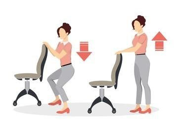 손을 의자 위에 가볍게 얹어놓은 상태에서 무릎을 굽혀 앉은 자세를 취한 뒤에 다시 일어납니다. 스쿼트 동작 시 균형을 잃지 않도록 도와주며 체중을 분산시켜 동작이 쉬워집니다.