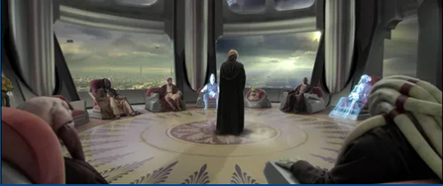 온 우주가 배경인 스타워즈의 '제다이 고등 평의회' 옅은 푸른색은 홀로그램으로 참여하는 모습이다. 미래의 광장은 이 와 유사하지 않을까?(자료 : 나무위키)
