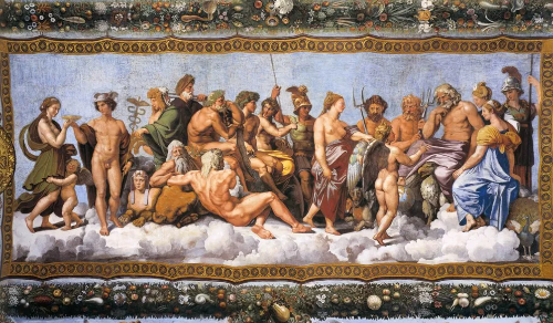라파엘로<신들의 회의>를 통해 올림푸스 신들의 공론장을 생각해볼 수 있다. 다만 이 그림에는 포세이돈이 자리한다. 어디에 위치하고 있을까?