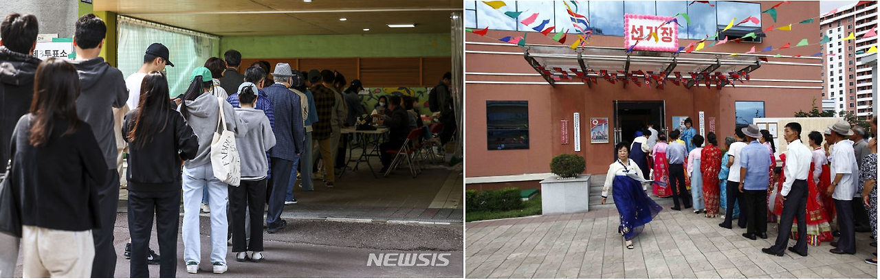 우리나라의 2024년 총선과 북한의 2019년 선거장 모습(자료 : 뉴시스; 자유아시아방송)