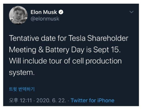 - 테슬라 배터리데이 9월로..2차전지 세계 1위 목표(이데일리, 2020)-
