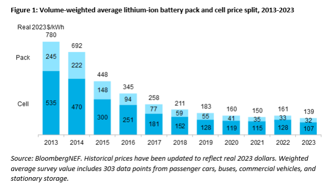 배터리 가격이 $100/kWh까지 내려가야 이론상 전기차와 내연기관차의 원가가 동등한 수준에 달한다고 하는데요. 2010년대부터 급격하게 하락해온 리튬이온 배터리의 가격은 2020년 이후 하락세가 완만해지며 정체된듯한 모습을 보이고 있습니다. 심지어 2022년에는 가격이 오히려 전년 대비 상승하기까지 했고요. 2023년 기준 $139/kWh를 기록했으니, 목표인 $100/kWh까지는 아직도 갈 길이 멉니다.