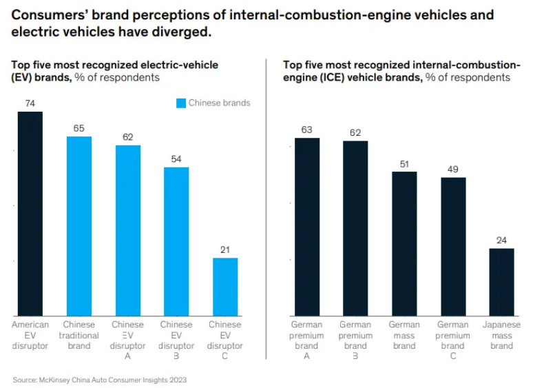 아래 그래프 우측에서 볼 수 있는 것과 같이, 기존 내연기관차 시장에서는 아직까지 독일, 일본 등 해외 제조사들의 브랜드 인지도가 절대적으로 높습니다. 하지만 좌측 전기차 시장에서는 이를 전혀 찾아볼 수 없는데요. 상위 5개사 중 1위인 테슬라를 제외한 나머지 4개는 모조리 중국 로컬 브랜드가 차지하고 있습니다. 특히 3-5위는 중국 전통 내연기관차 브랜드가 아닌, 샤오펑, 리 오토 등과 같은 신생 전기차 브랜드인 것으로 보이고요.