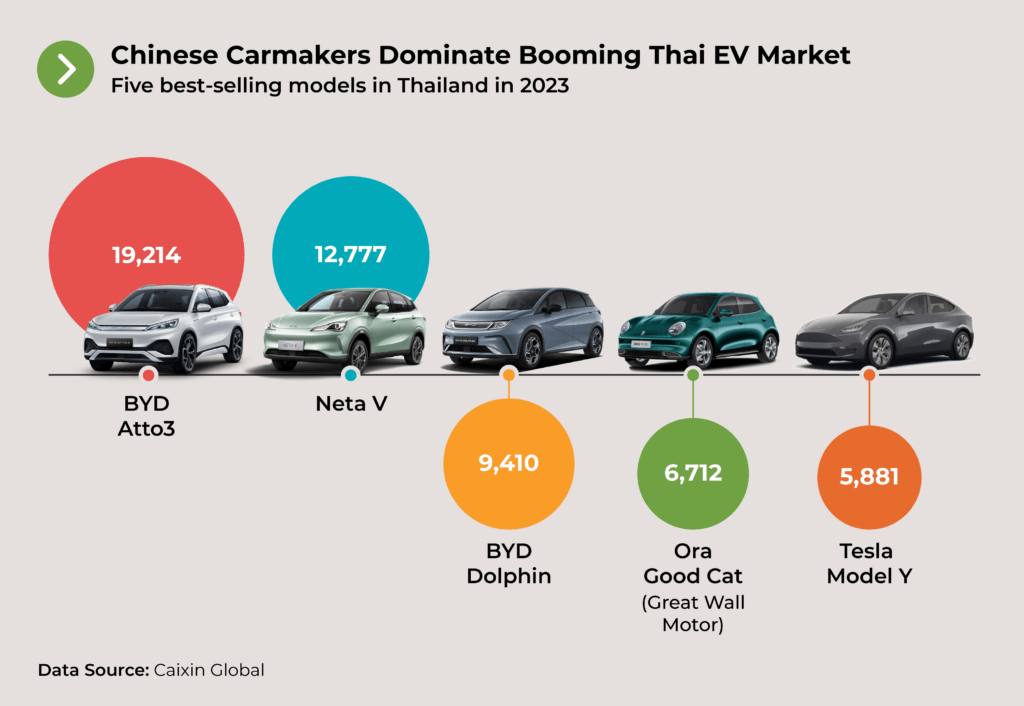이렇게 파죽지세로 성장 중인 중국 전기차는 중국 내수를 넘어 글로벌 시장까지 노리고 있습니다. 대표적인 사례가 동남아 시장인데요. 토요타, 닛산 등 일본차가 호령하던 동남아 시장이 이제 중국 전기차의 텃밭으로 변해가고 있습니다. 실제로 태국의 경우, 아래 그림과 같이 가장 잘 팔리는 전기차 Top 5 중 테슬라를 제외하면 나머지 4개 차종 모두 '중국산'입니다. 비록 테슬라, 현대기아차보다 품질과 성능이 뒤떨어진다 할지라도, 압도적인 가격 우위를 바탕으로 공격적으로 성장해나가고 있는 겁니다.
