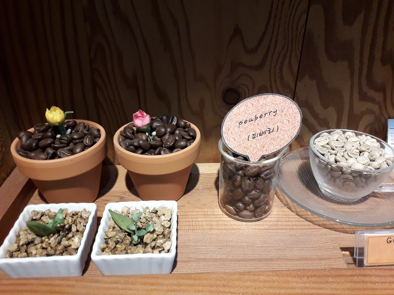 입구에 인테리어로 널려 있는 커피콩들과 커피드립에 필요한 아이템들이 눈에 들어왔다.
