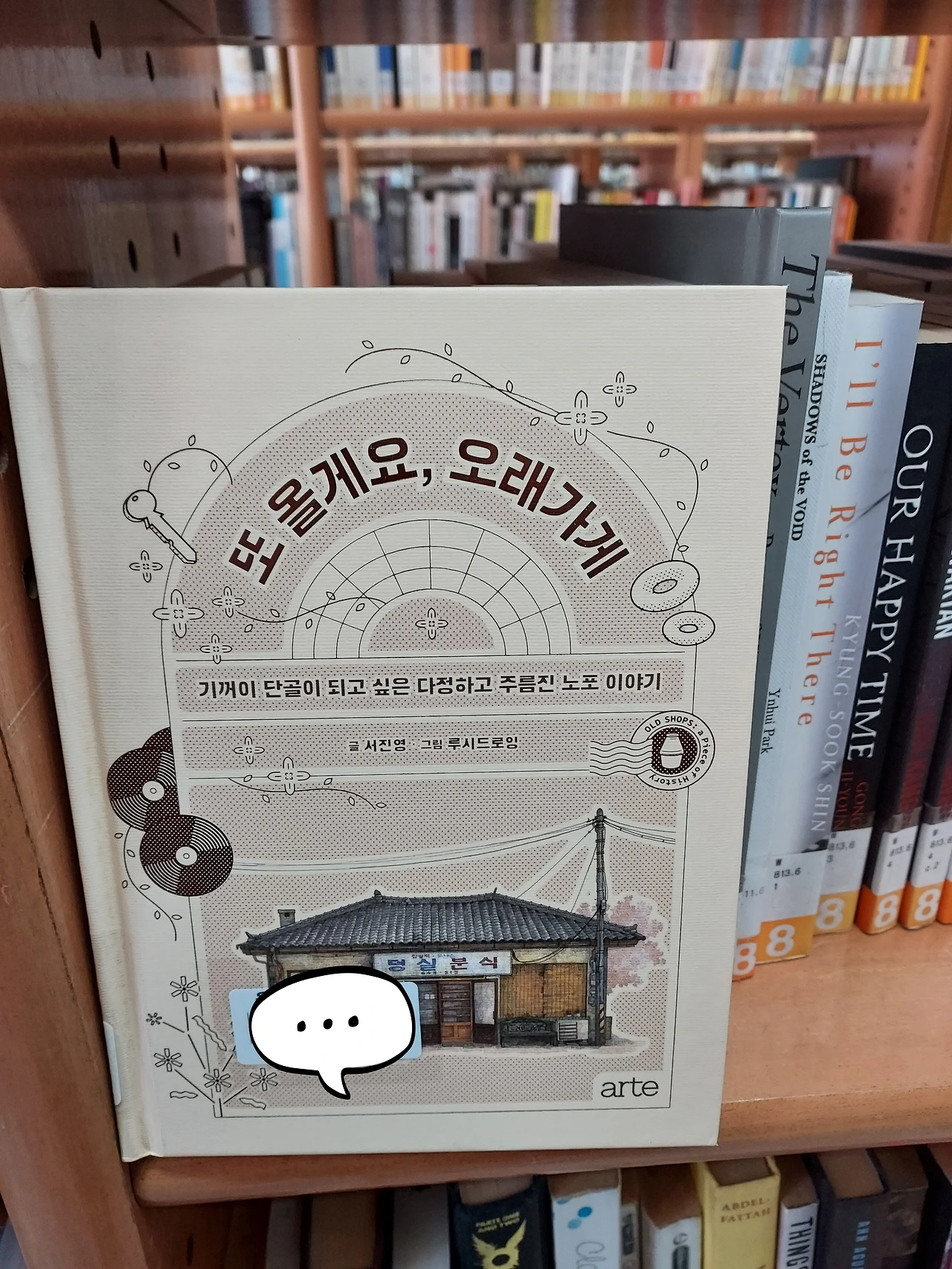 하드 커버지의 《또 올게요. 오래가게》는 얼떨결에 잡힌 겁니다. 이 책이 꽂혀있던 아랫칸에서 원하는 책이 없어서 위아래를 스캔하다가, 하드커버와 멋 부리지 않은 그림과 노포 여행에 대한 글에 흥분해서 얼른 뺐죠. 찾는 사람이 있는지 읽으면서 자꾸 묻고 기다려서인지 글이 느리게 가는 중입니다. 어제 다 읽고 자려고 누워서 눈을 감고서도 '내가 가볼 노포'를 지도 위에 그리다가 잠을 설쳤답니다. 그덕에 아침에 출근해서 거울을 보니 눈동자 흰자위 언저리에 뻘건 펜스를 쳐놓은듯 제 눈이 조금 무섭더군요.