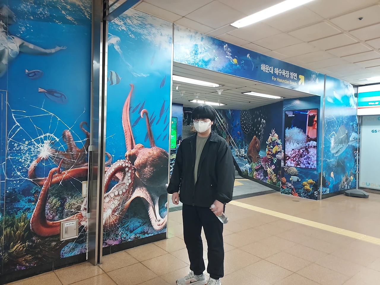 '해운대'는 사람 가슴 깊은 곳의 열기를 끌어올리는 곳이 분명했다. 예상치 않은 열기가 확 치고 밖으로 밀려 나왔다.해운대역 개찰구를 빠져나와 밖으로 나가는 출구에 인테리어 한해양수족관 그림부터 시선을 끌었다. 출구 계단을 걸어 위로 올라가면 해안까지 길게 이어진 도로 중간에 꽃 대궐(대문?) 조경이 인위적으로 조성되어 있고. 지하철에서 2백 미터 정도를 걸어 해운대 백사장에 도착하니... 이번엔 사람들 시선을 신경 쓰지 않아도 되는 '마냥 자유'가 해변을 채운 군중들 사이를 휘몰이 장단에흠뻑 고조되어 있었다.