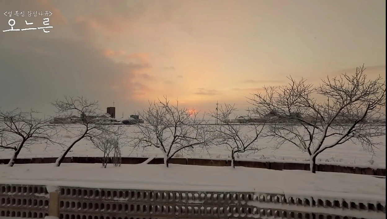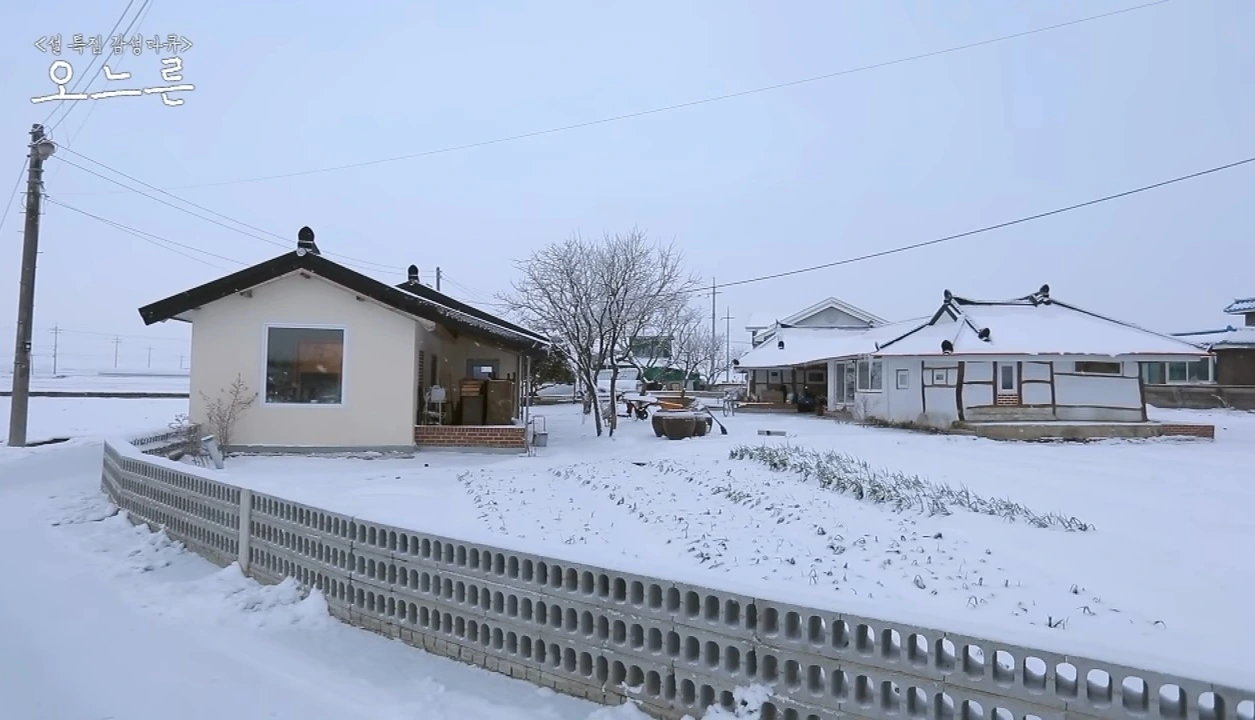 겨울에 눈 내린 시골 마을을 보며 쉰다.