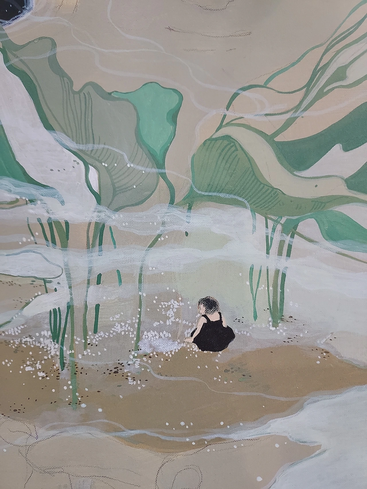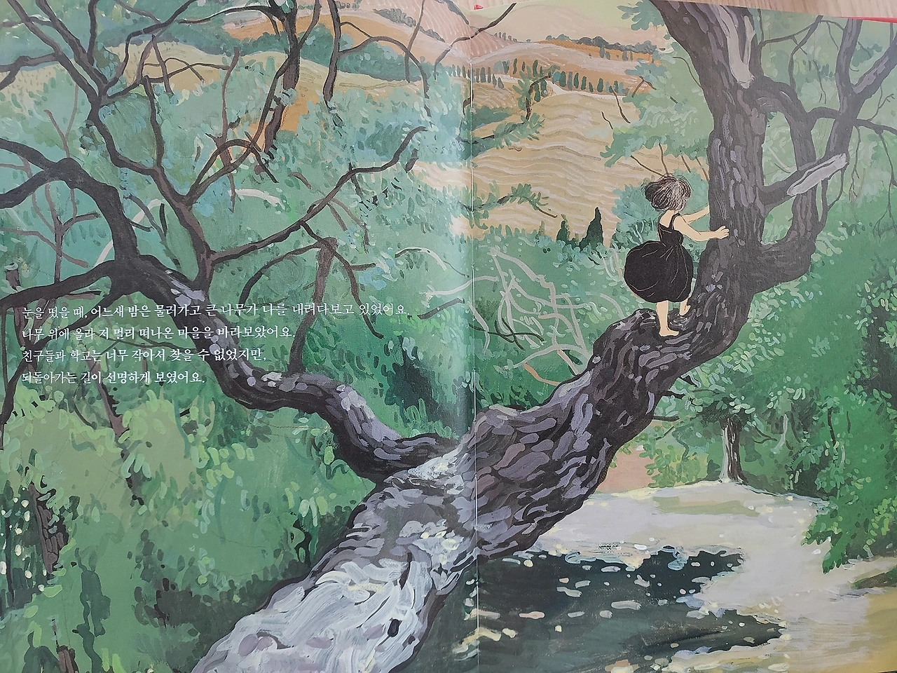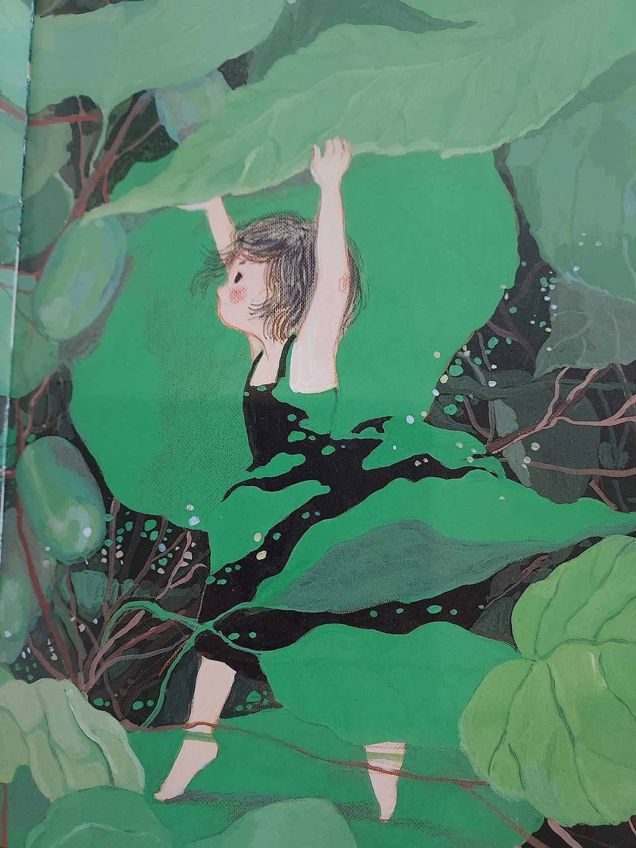 '질문하는 소리. 거대한 꽃들과의 인사. 맨발로 숲길 걷기. 춤추는 풀벌레를 따라 춤추기. 푸른 정원에 내리는 비. 거인의 서재' 소녀가 잠깐 가만히 있어야 하는 순간입니다.