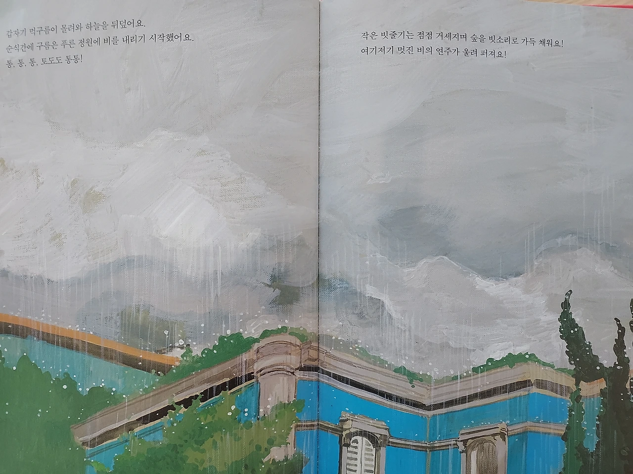 순식간에 구름은 푸른 정원에 비를 내리기 시작했어요.