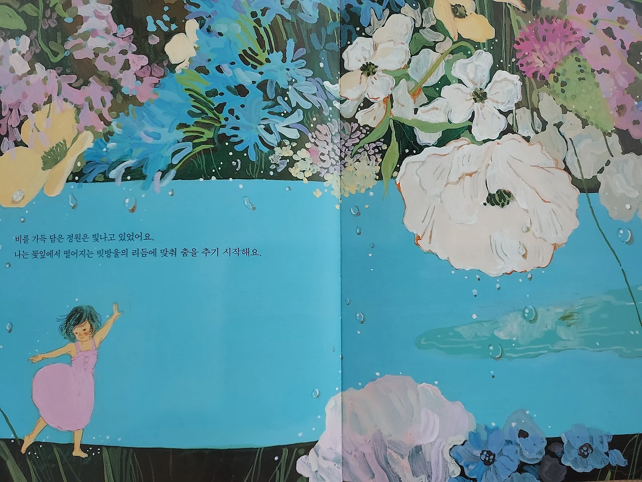 비를 가득 담은 정원은 빛나고 있어요. 나는 꽃잎에서 떨어지는 빗방울의 리듬에 맞춰 춤을 추기 시작해요.