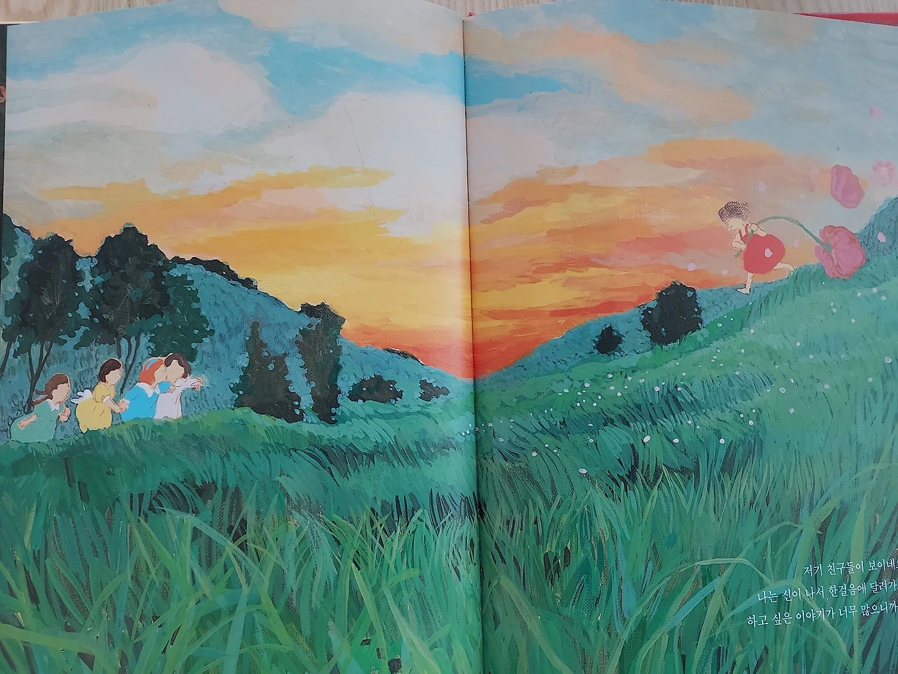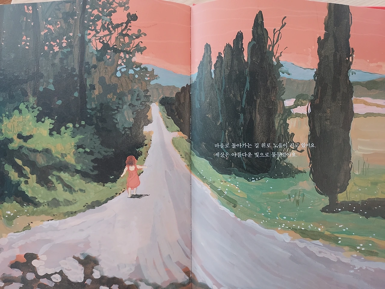 마을로 되돌아가는 길 위로 노을이 지고 있어요. 세상은 아름다운 빛으로 물들었어요.