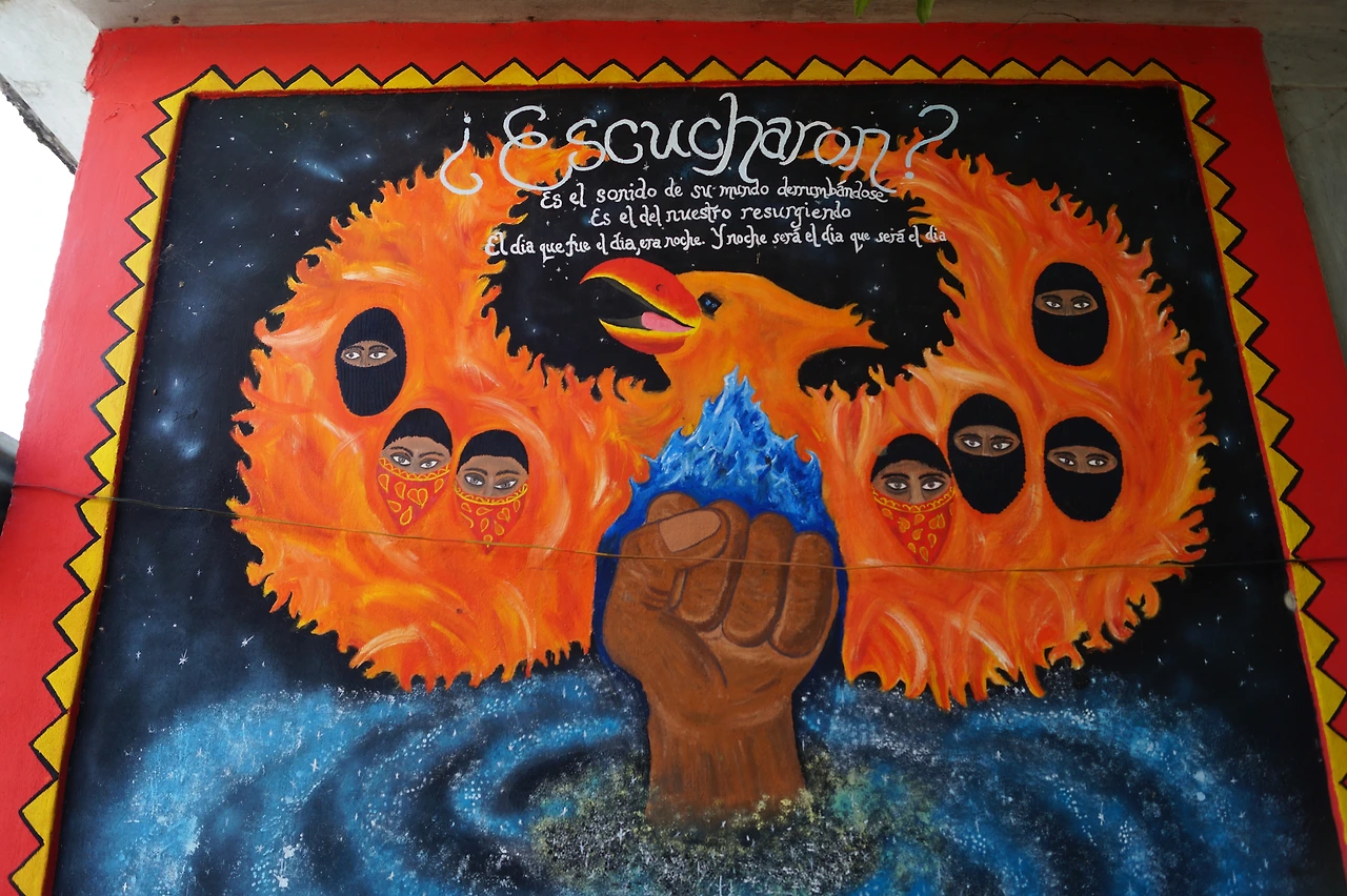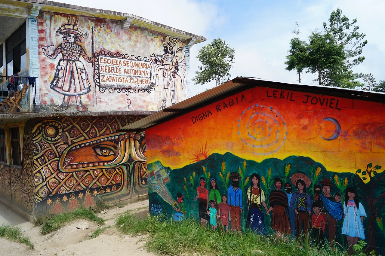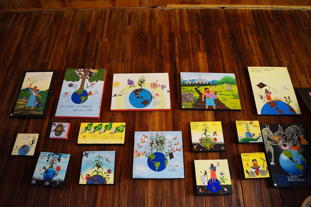 벽화와 마을의 모습을 담기 위해 사진을 찍어도 되는지 우리와 동행하는 관리자에게 확실하게 허락을 받았기에 마누라는 마음을 놓고 정부와 세상에게로 살아 움직이며 소리치는 듯한 그들의 벽화를 카메라에 담을 수 있었다. 인터넷에서는 에밀리아노 사파타의 얼굴이 그려진 강당과 체의 벽화 말고는 더 다양한 벽화를 볼 수는 없었는데 이곳에 사는 인디 헤나들에 대한 이야기를 나누며 학교 안으로 들어가니 에너지가 넘치는 작품들이 마구마구 쏟아져 나온다.