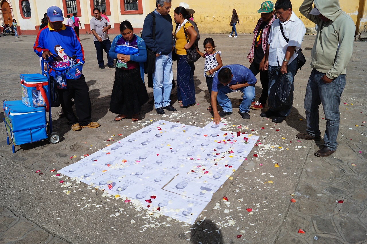 아이, 어른, 인디헤나, 전 세계에서 온 외국인들 할 것 없이 입술을 꽉 다문채 억울하게 살해당한 것으로 추정된 젊은이들의 흑백사진을 내려다 보고 있다.